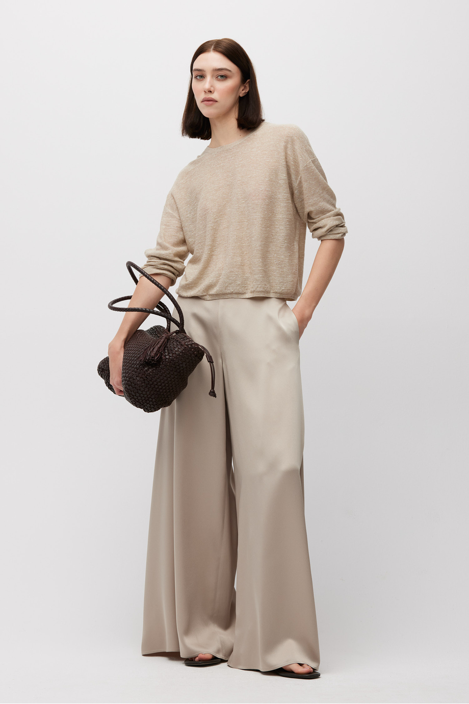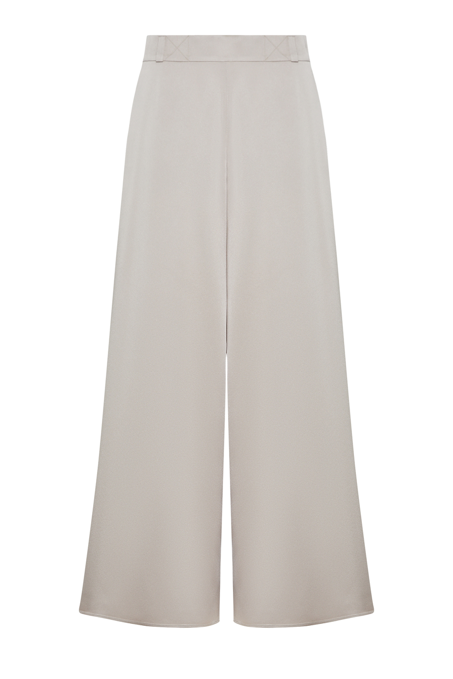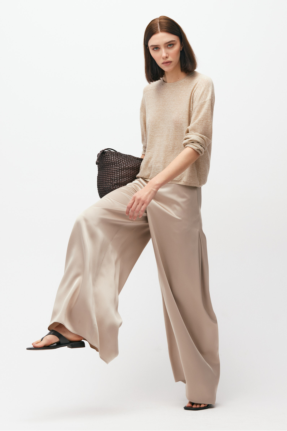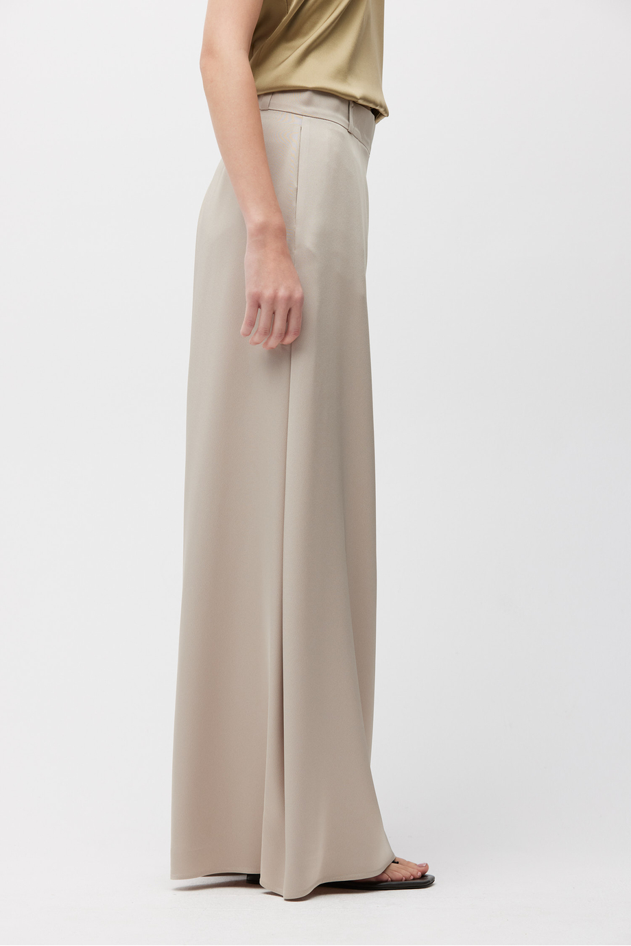 Pantaloni bej confecționați dintr-o țesătură fluidă, un amestec de acetat și viscoză. Închidere laterală cu fermoar. Buzunare. Croială cu picior larg.