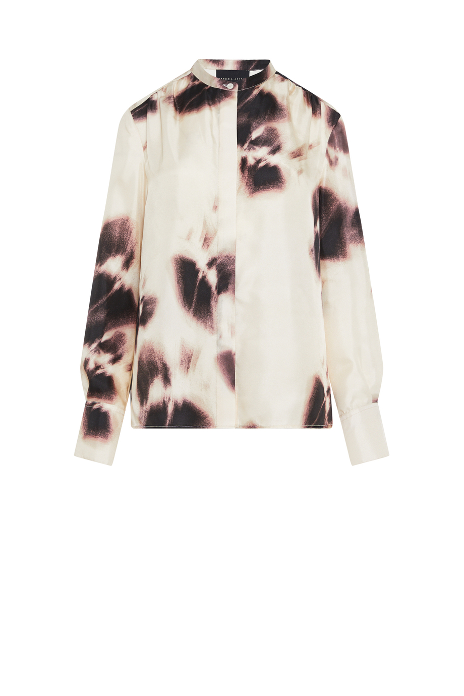 Cămașă lejeră din mătase cu model. Închidere cu nasturi ascunși în plachetă. Mâneci lungi, guler tip tunică. Pentru completarea setului – pantaloni din aceeași țesătură.