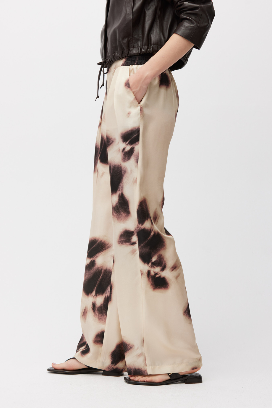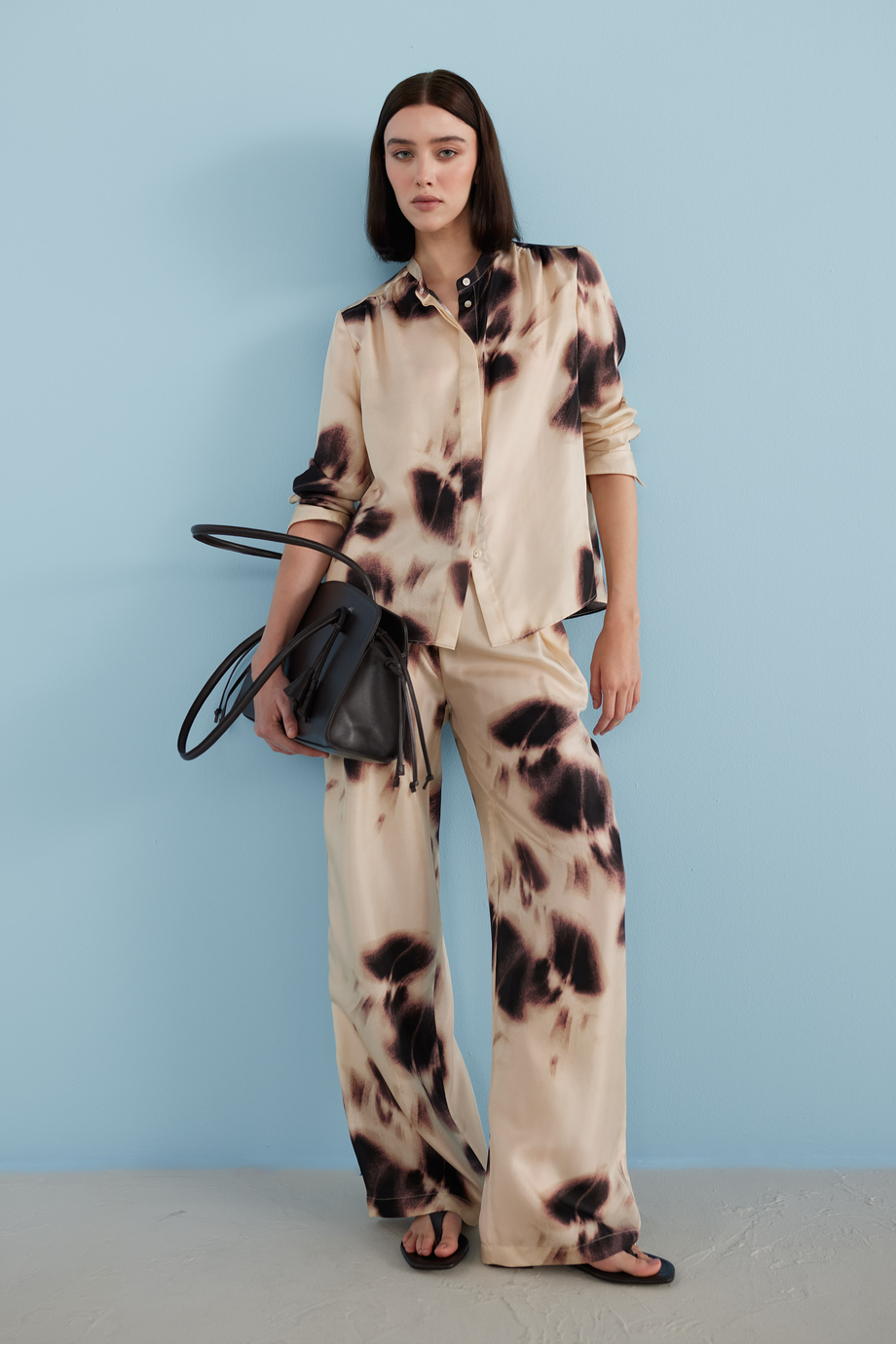 Pantaloni din mătase cu talie înaltă. Croială cu picior larg. Interior finisat cu bandă decorativă. Buzunare. Pentru completarea setului – cămașă din aceeași țesătură.