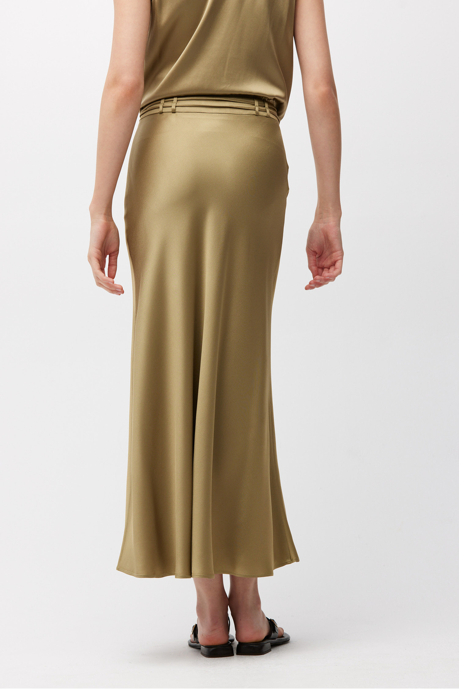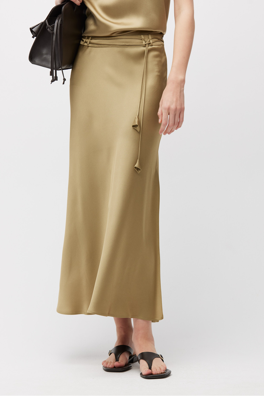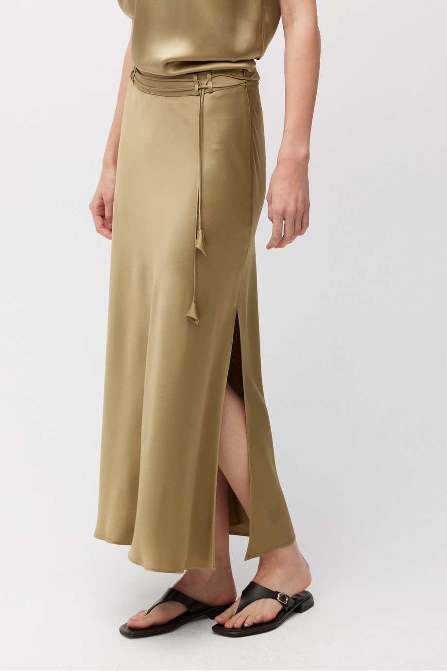 Fustă realizată dintr-o țesătură fluidă, un amestec de viscoză și acetat. Lungime midi, cu fantă laterală. Curea subțire cu ciucuri pentru evidențierea taliei.