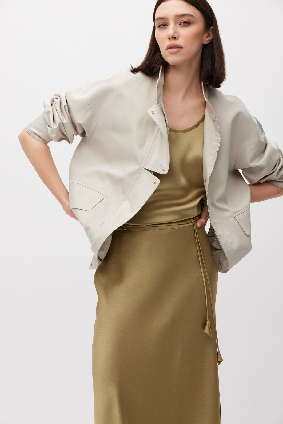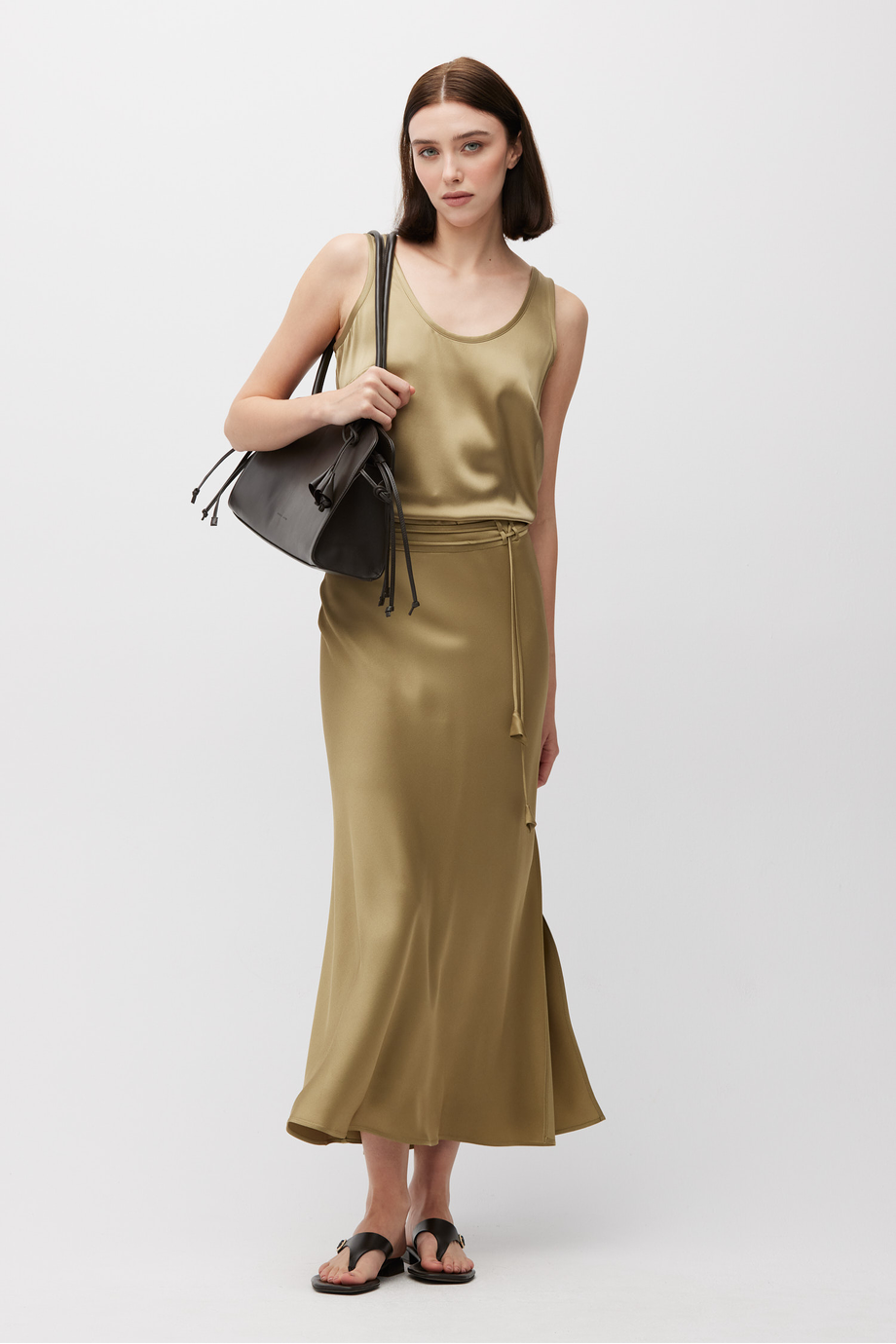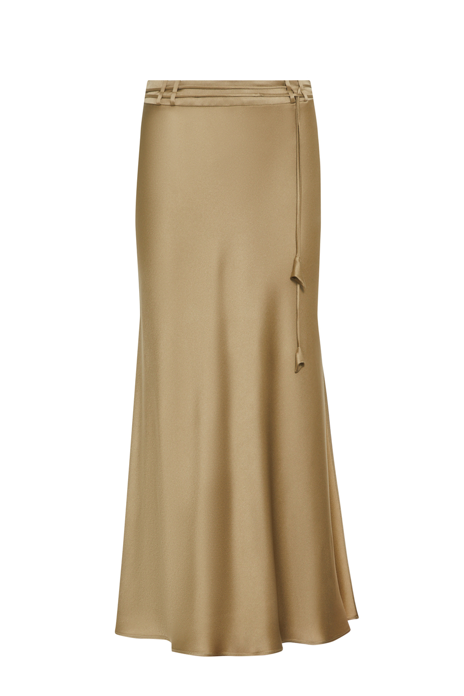 Fustă realizată dintr-o țesătură fluidă, un amestec de viscoză și acetat. Lungime midi, cu fantă laterală. Curea subțire cu ciucuri pentru evidențierea taliei.