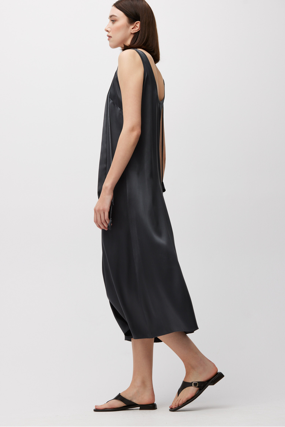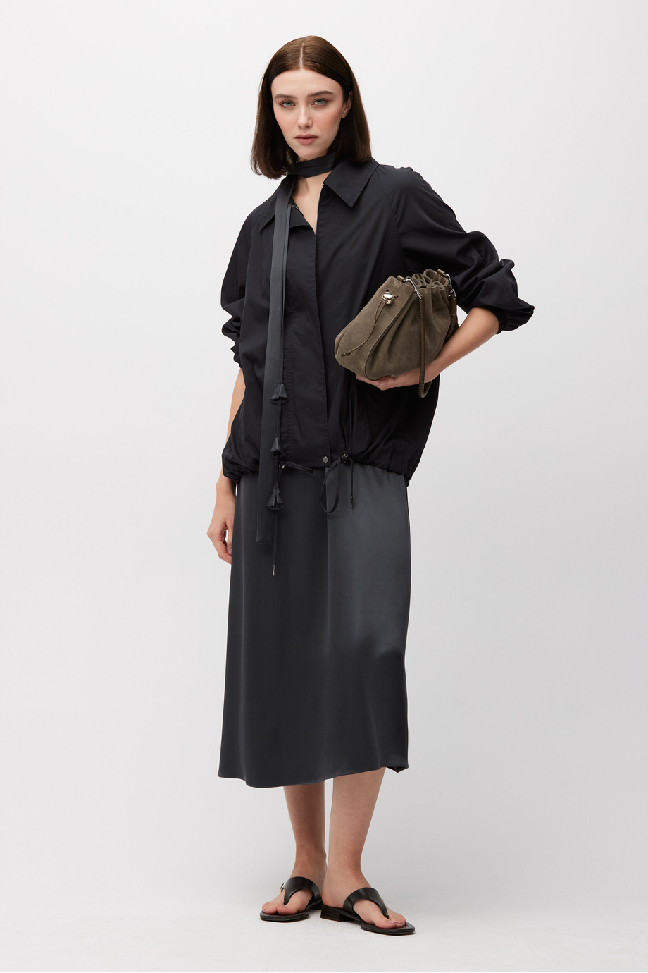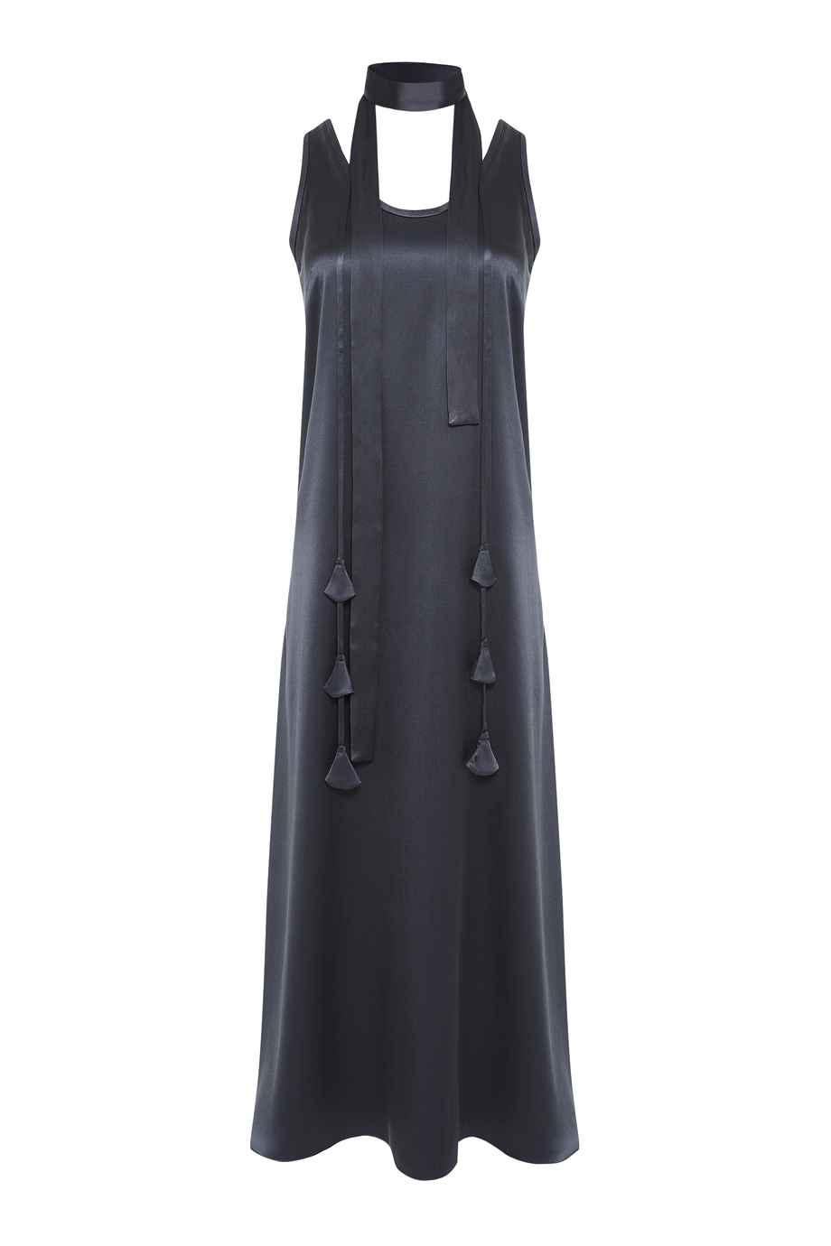 Rochie din mătase cu ciucuri, realizată din mătase plină și structurată. Lungime midi. Croială ușor evazată în formă de A. Curea cu ciucuri care poate fi legată în talie.
