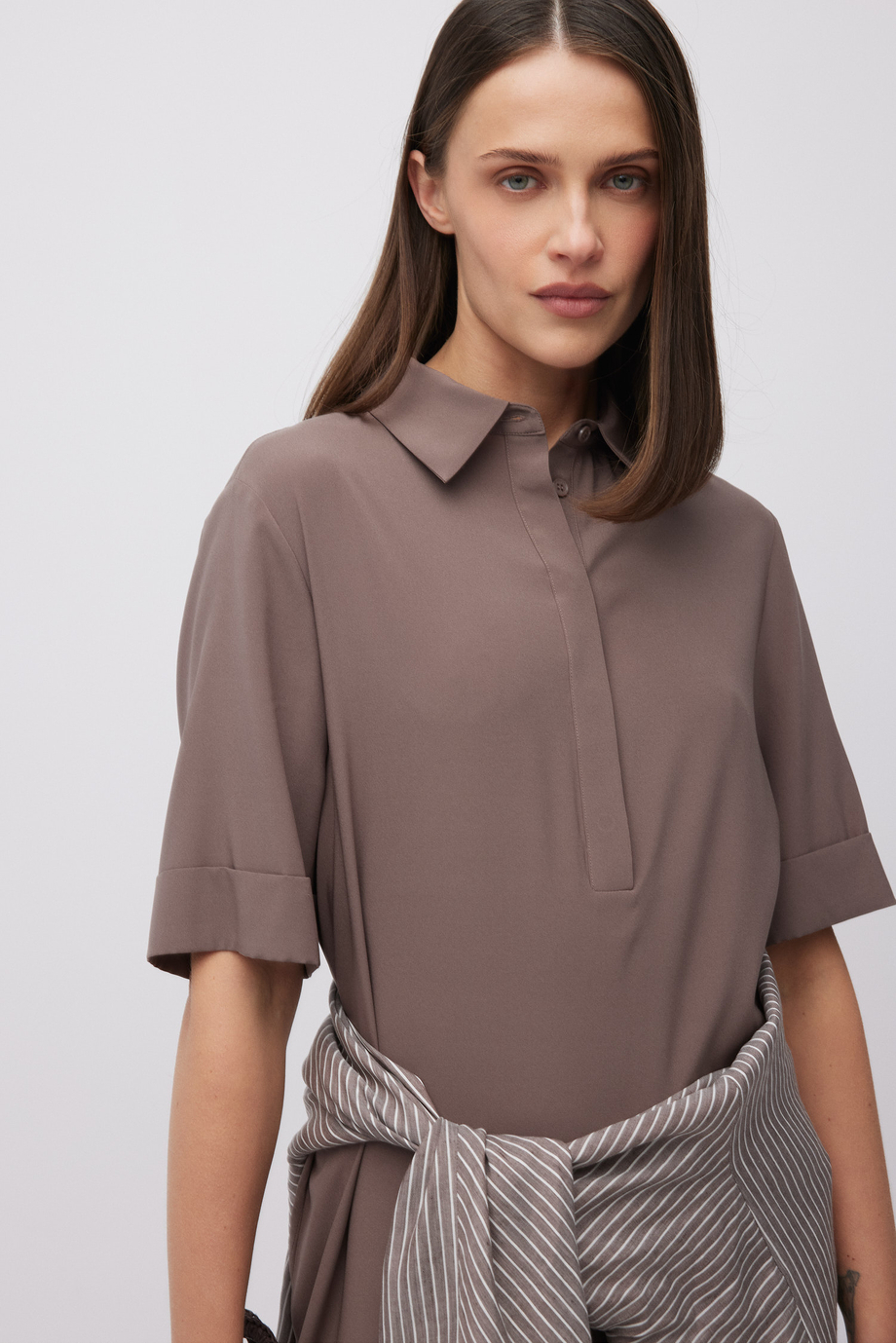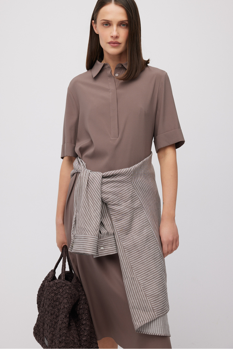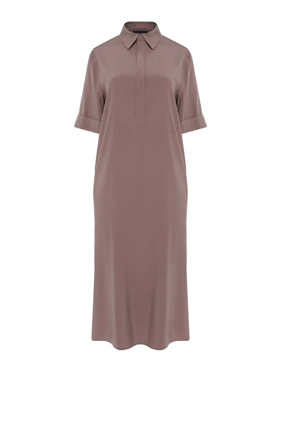Rochie cămașă din mătase. Croială simplă, lejeră. Partea superioară se închide cu nasturi din sidef ascunși în plachetă. Guler, mânecă scurtă.
