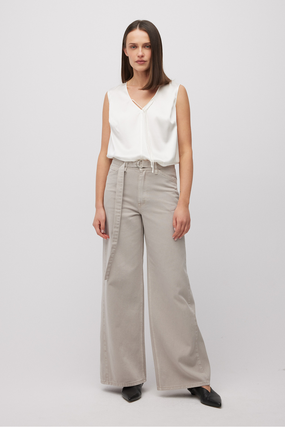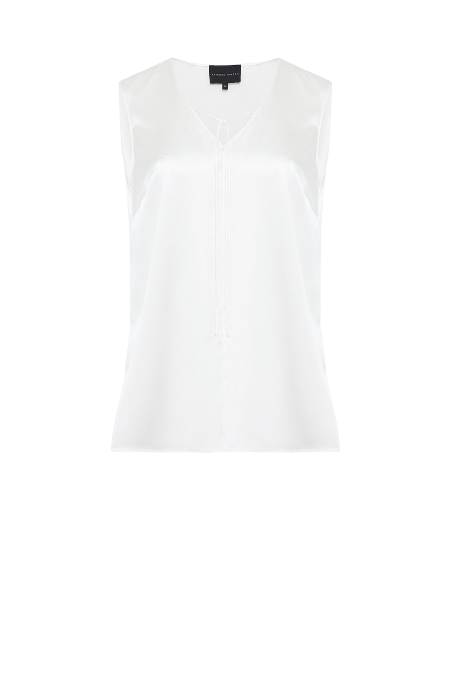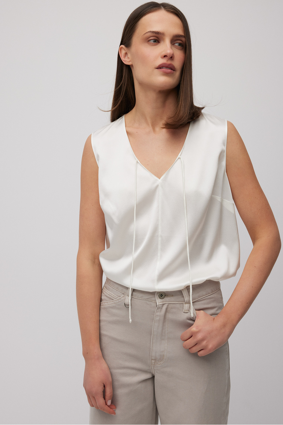 Top alb din mătase. Croială lejeră. Decolteu în V, cu legare.