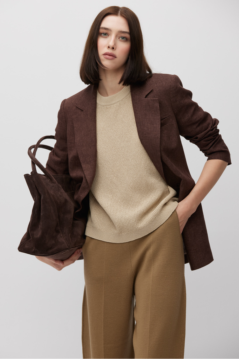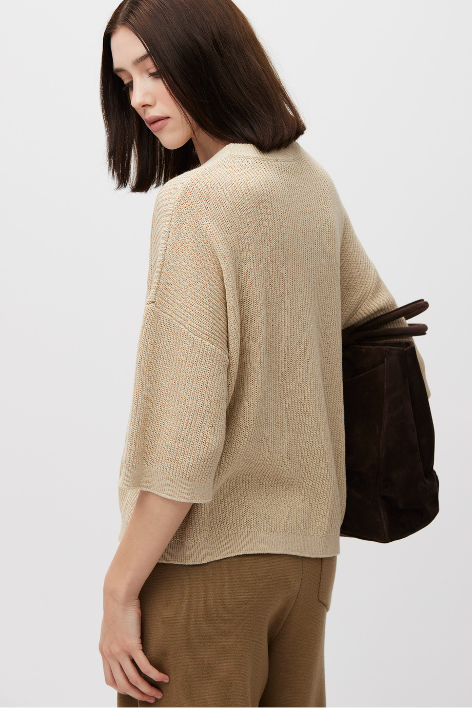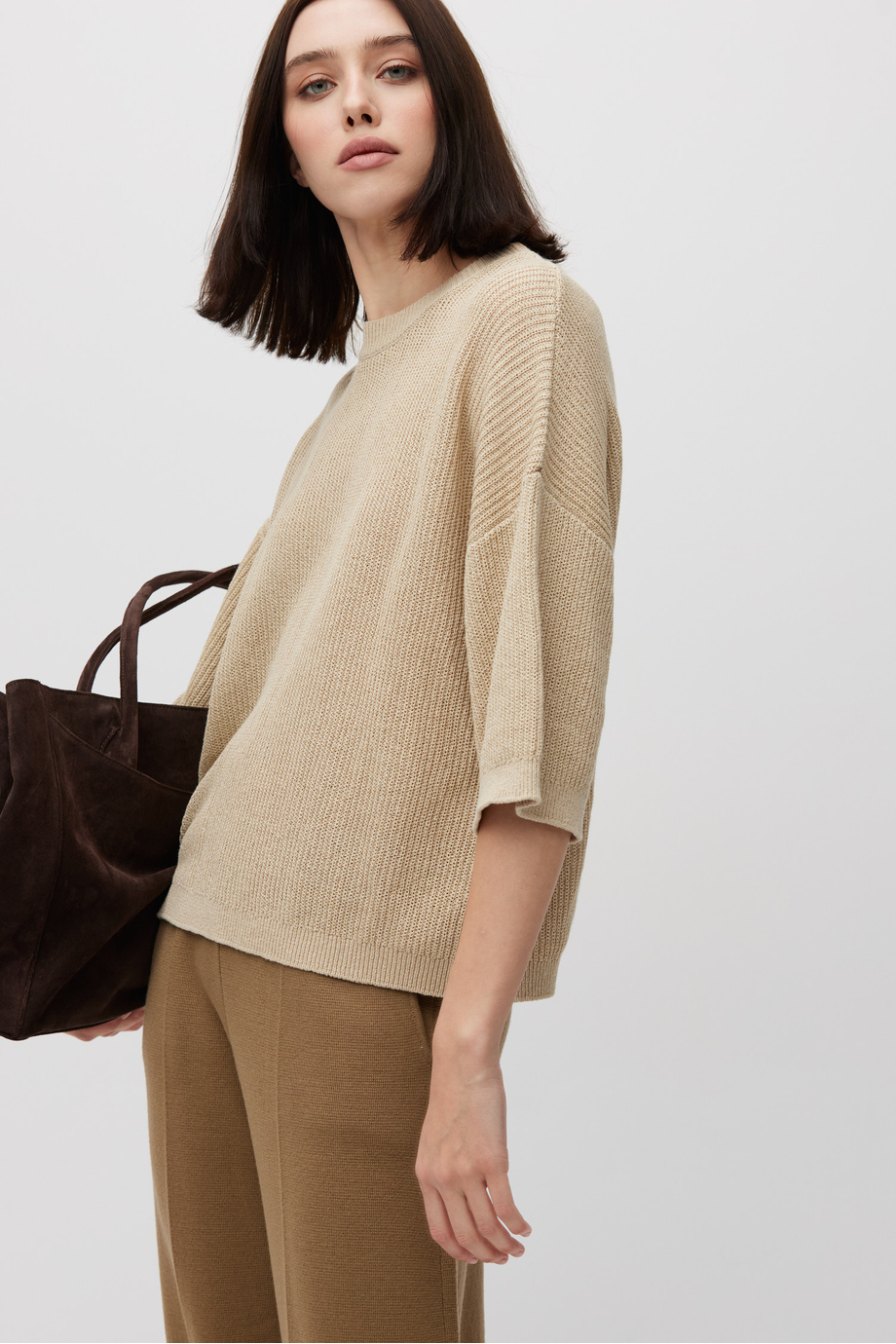 Pulover bej, lejer, cu mânecă scurtă. Tricot moale, răcoros la atingere, cu structură rib lejeră, realizat pe mașină cu finețea 7 GG.