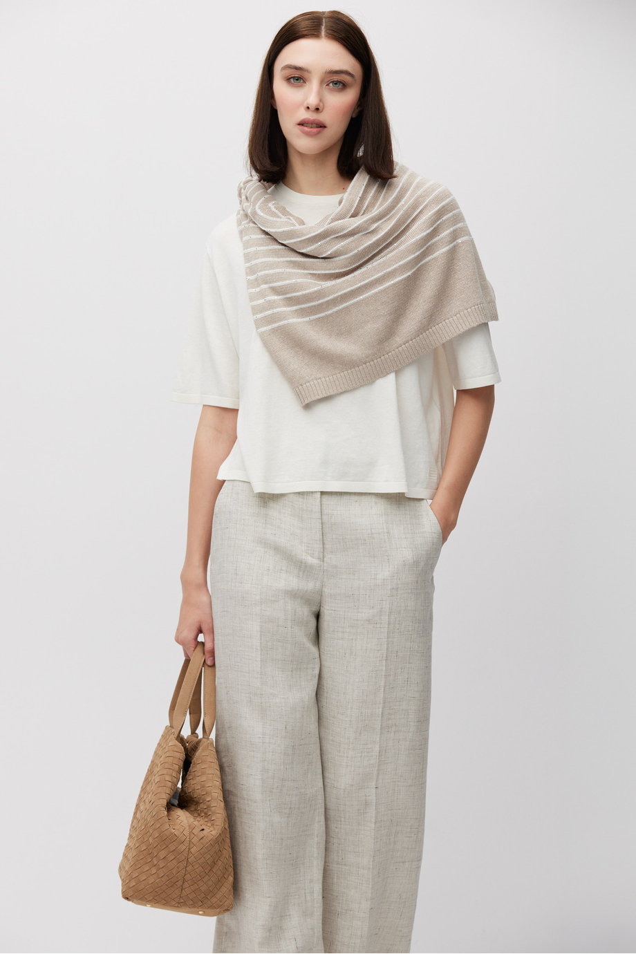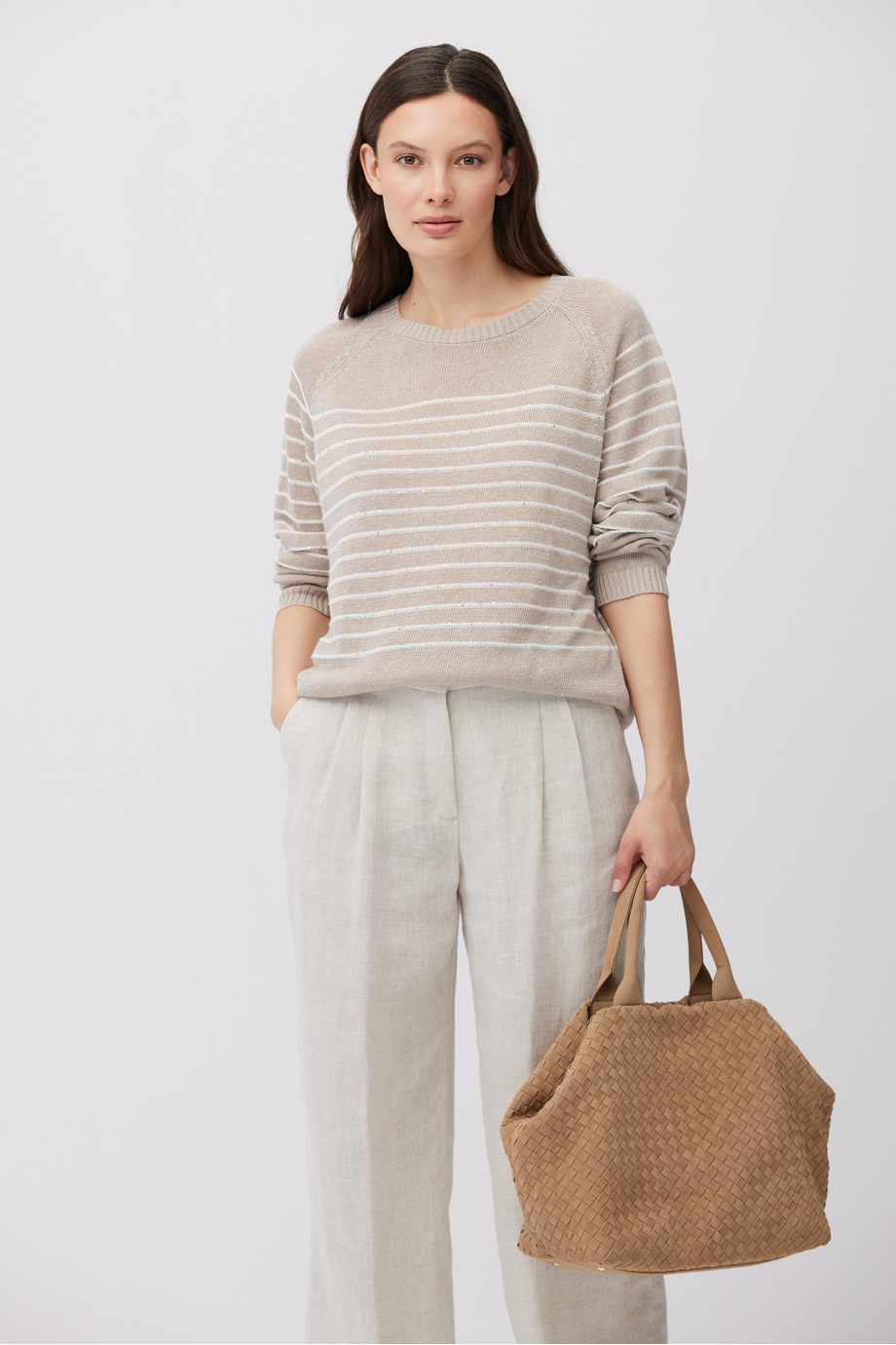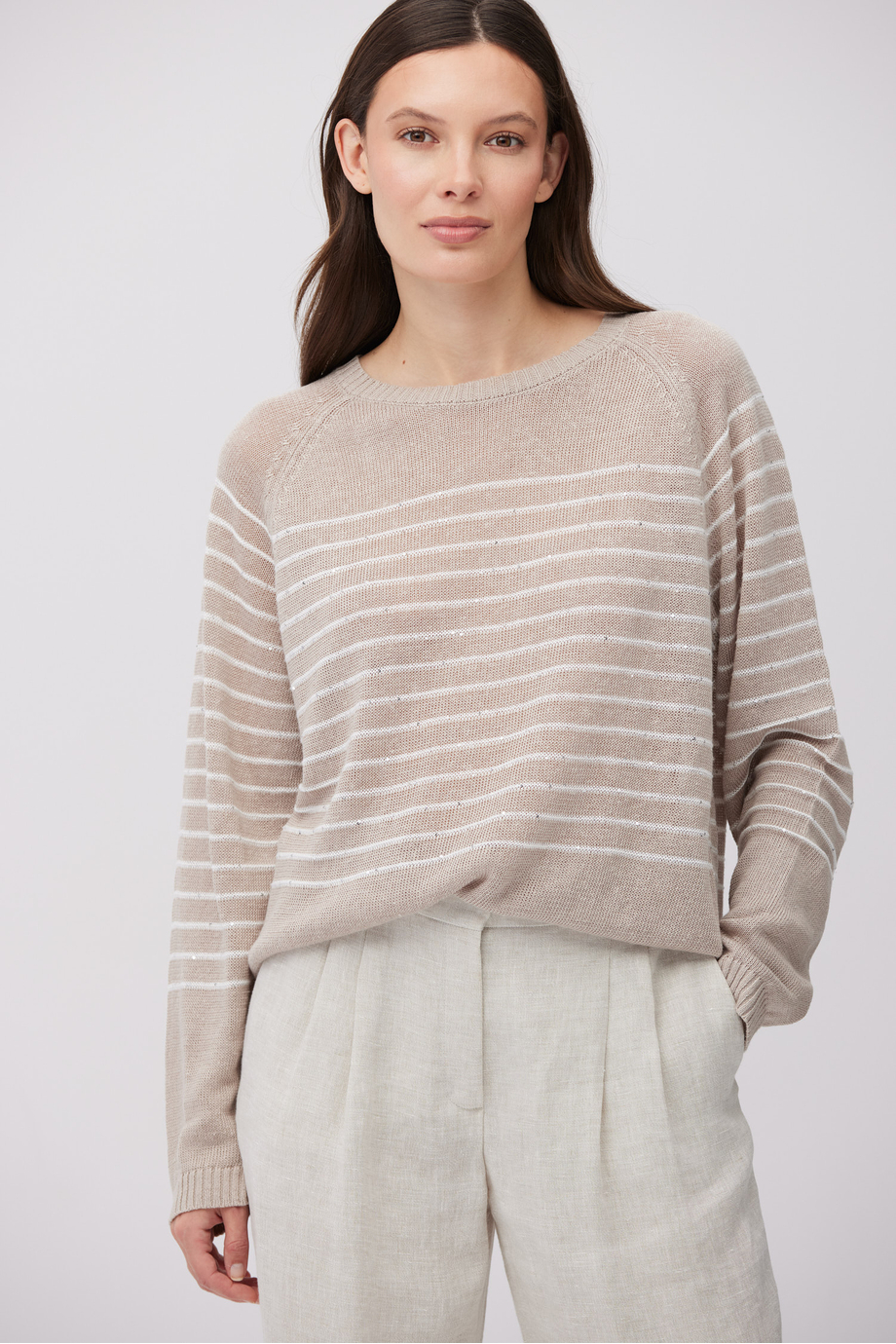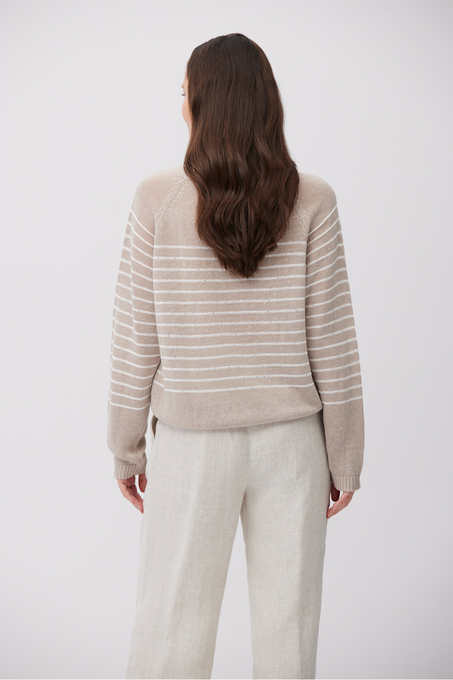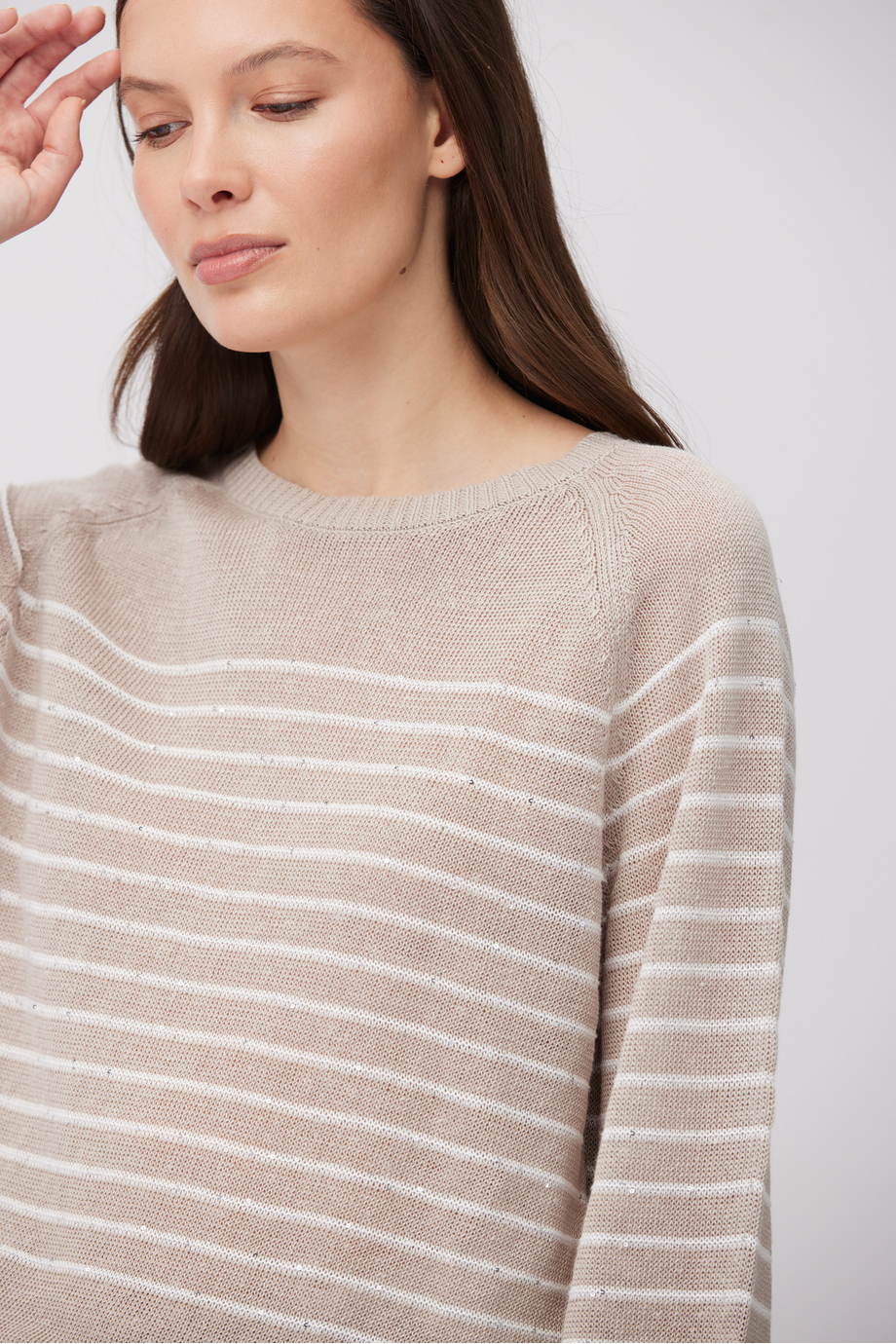 Pulover din in cu dungi. Decolteu rotund, mânecă lungă, croială lejeră. Tricot single jersey cu structură rară, cu paiete discrete, realizat pe mașină cu finețea 7 GG.