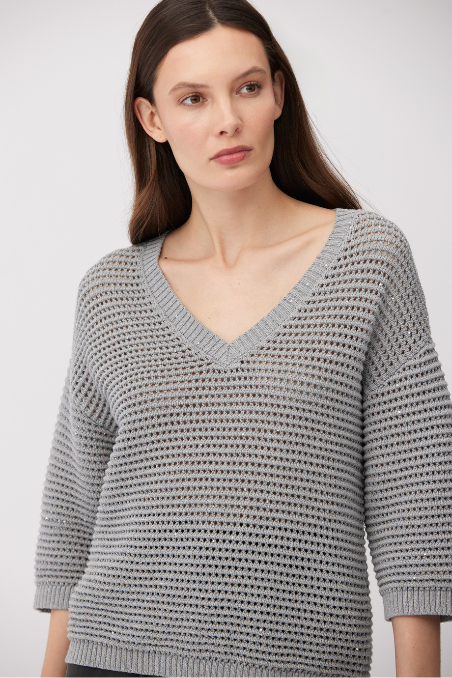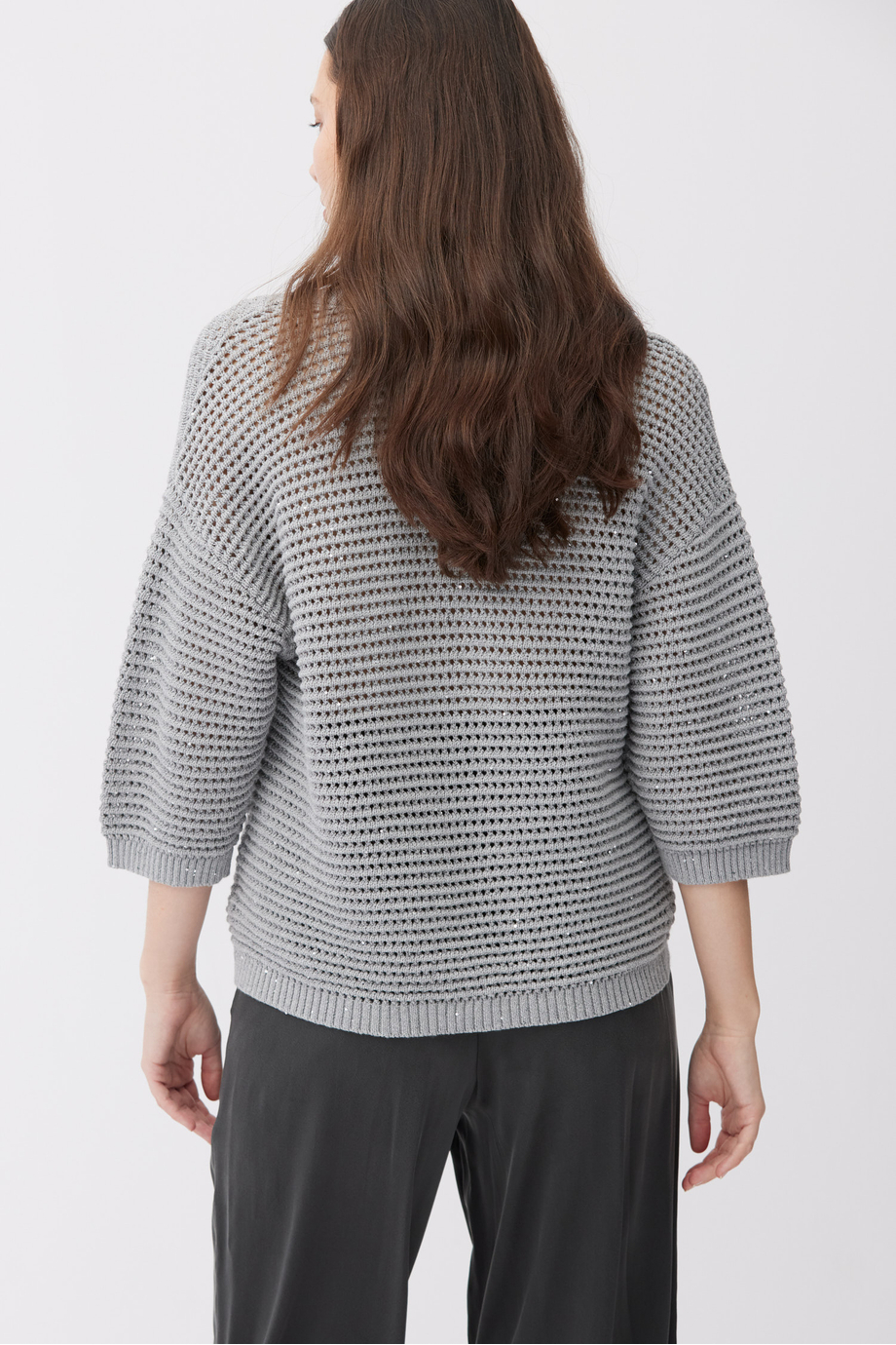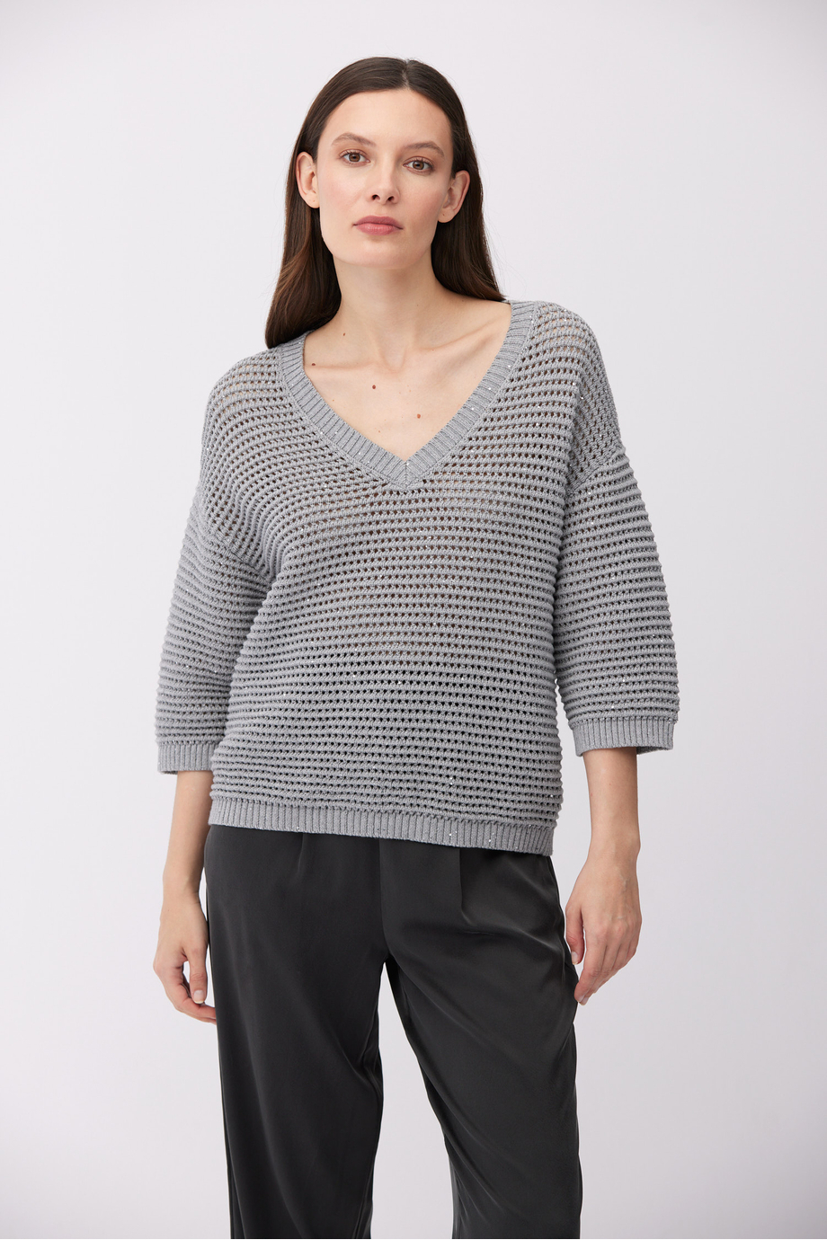 Pulover din bumbac și in. Decolteu în V, mânecă 3/4, croială lejeră. Tricot cu structură aerisită, ajurată, realizat pe mașină cu finețea 5 GG. Culoare gri.