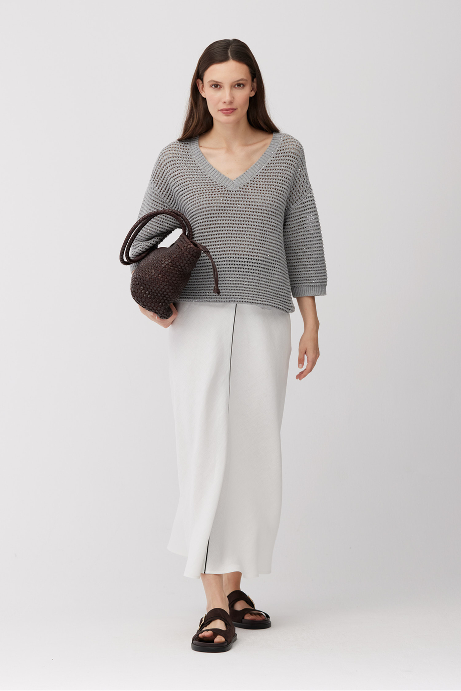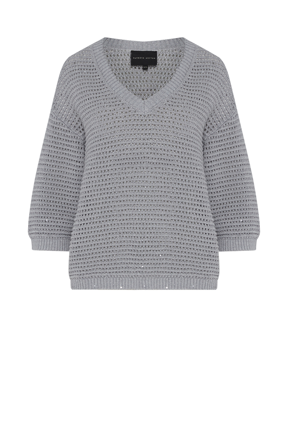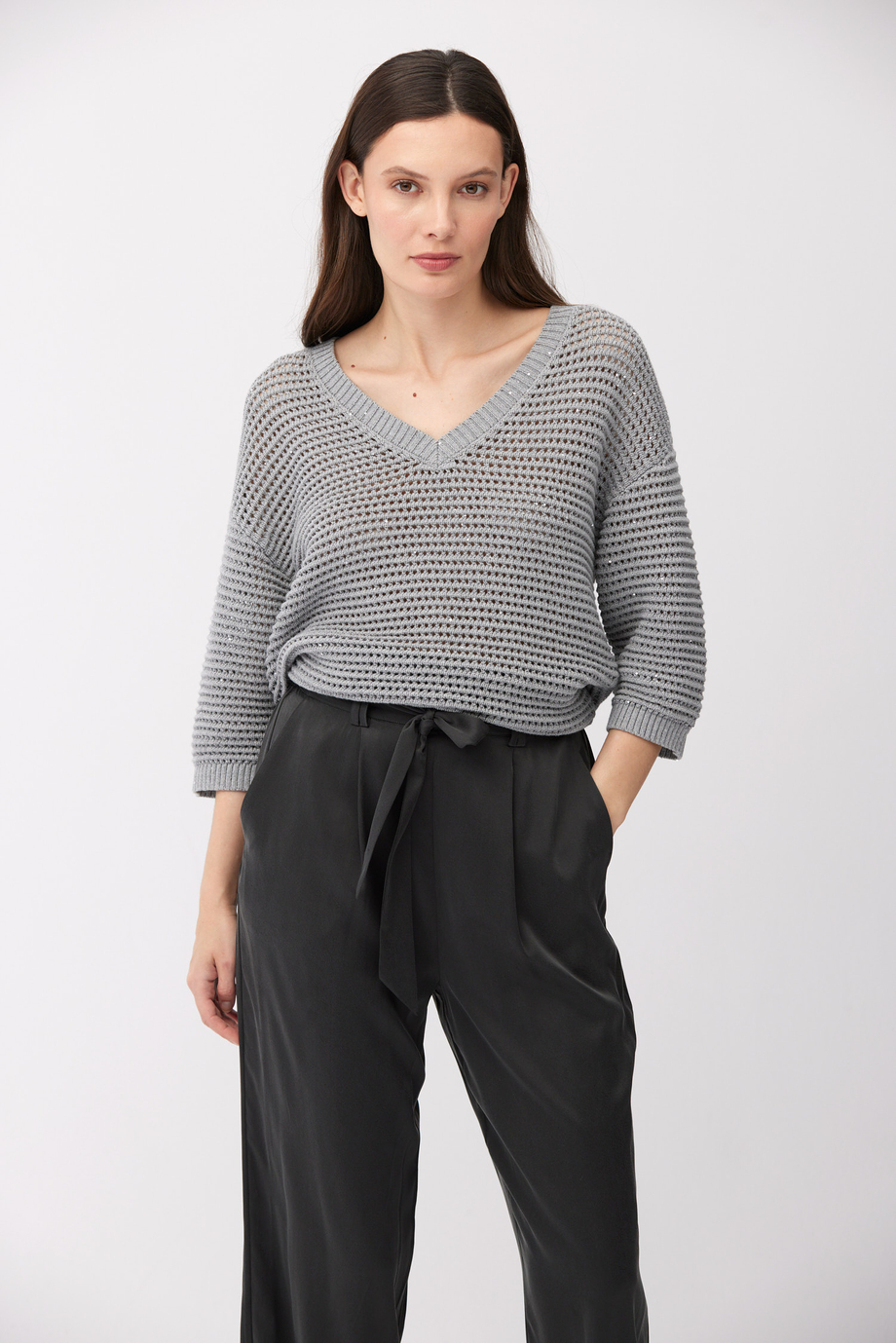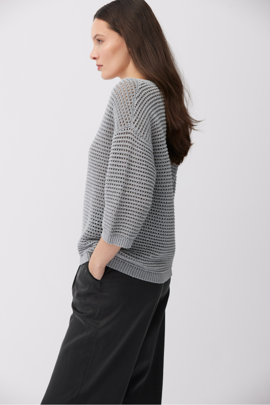 Pulover din bumbac și in. Decolteu în V, mânecă 3/4, croială lejeră. Tricot cu structură aerisită, ajurată, realizat pe mașină cu finețea 5 GG. Culoare gri.