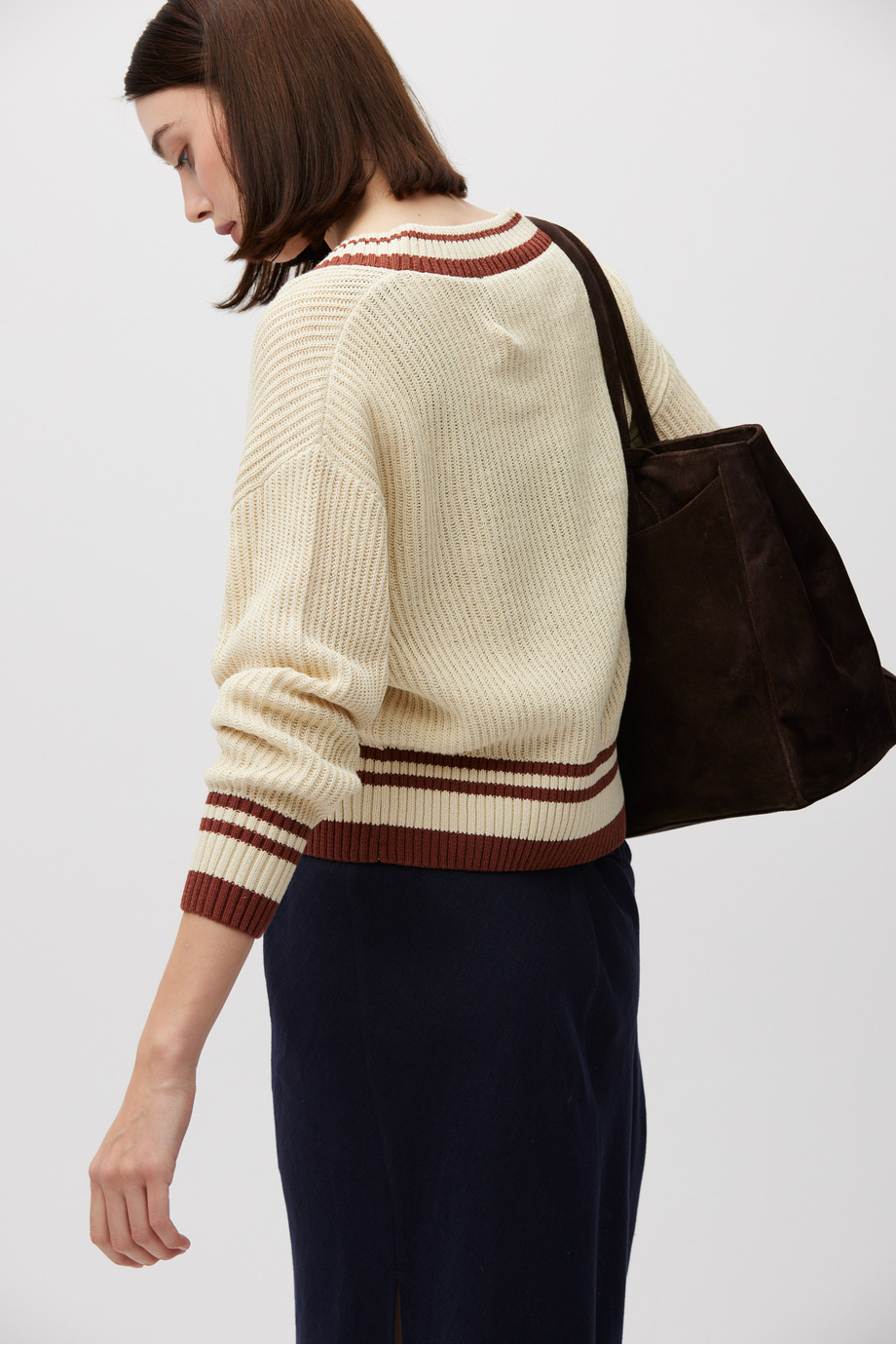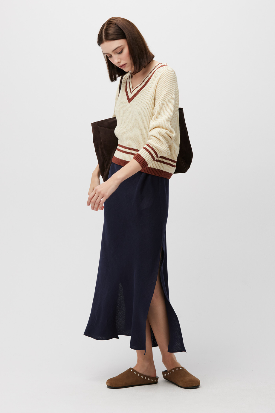 Pulover cu decolteu în V din amestec de bumbac și in. Croială lejeră, mânecă lungă. Tricot moale cu structură aerisită, realizat pe mașină cu finețea 5 GG.