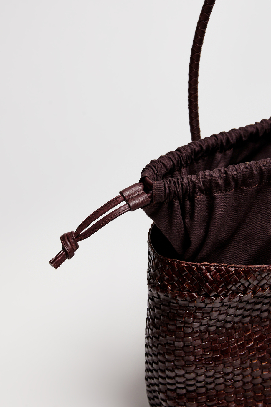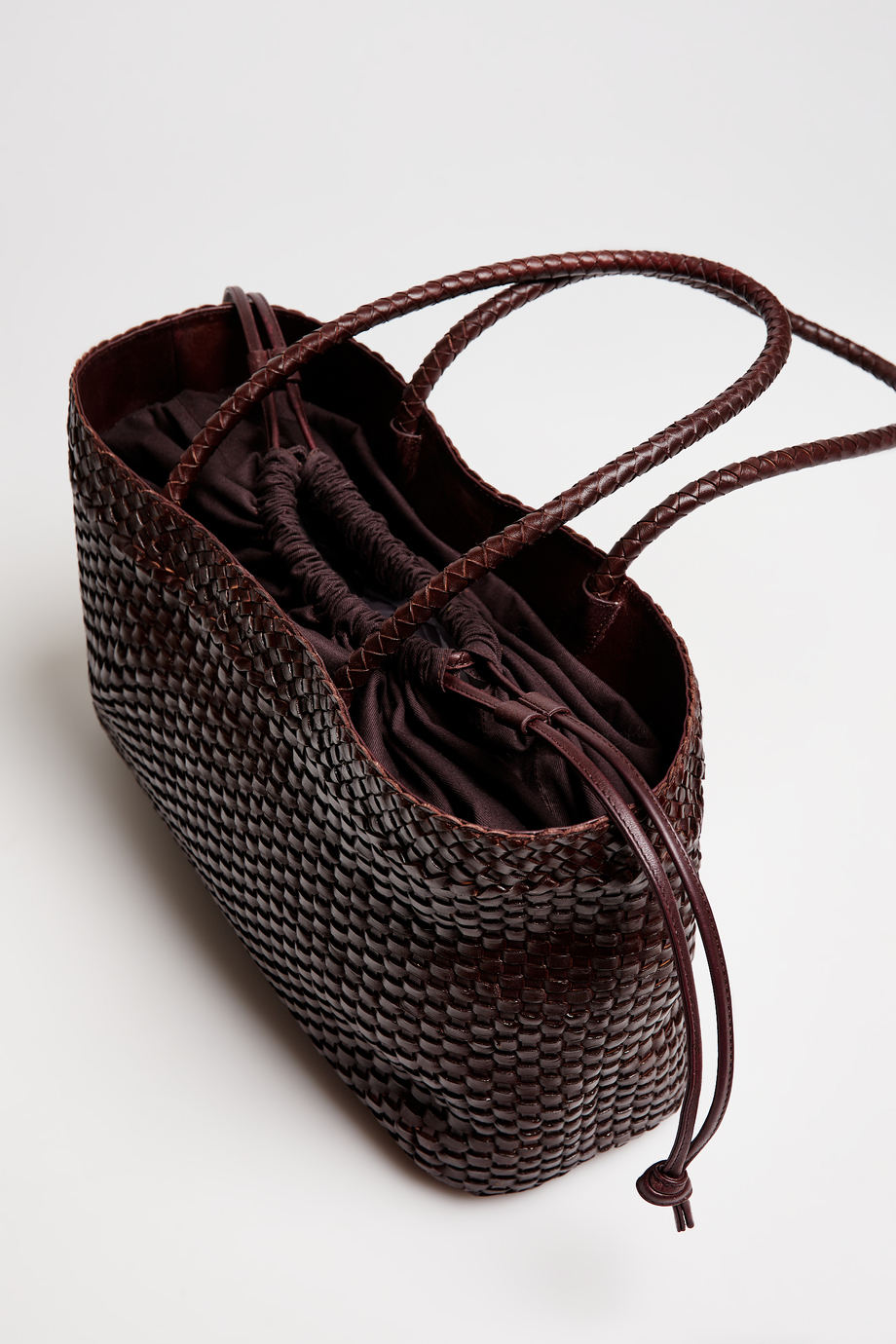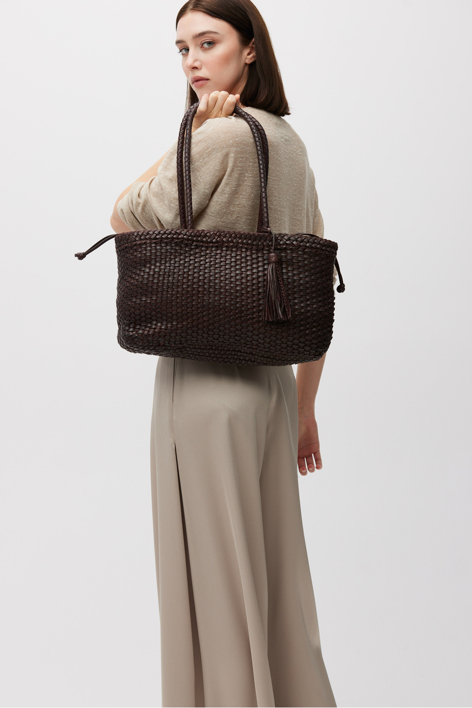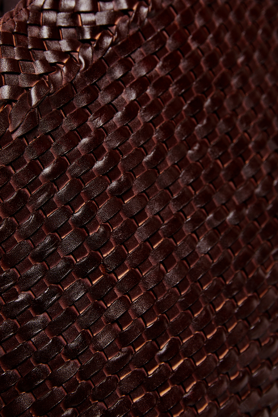 Geantă/coș din piele împletită maro. Căptușeală din bumbac în culoare ciocolată. În interior o mică buzunar cu închidere. Mânere împletite din piele.
