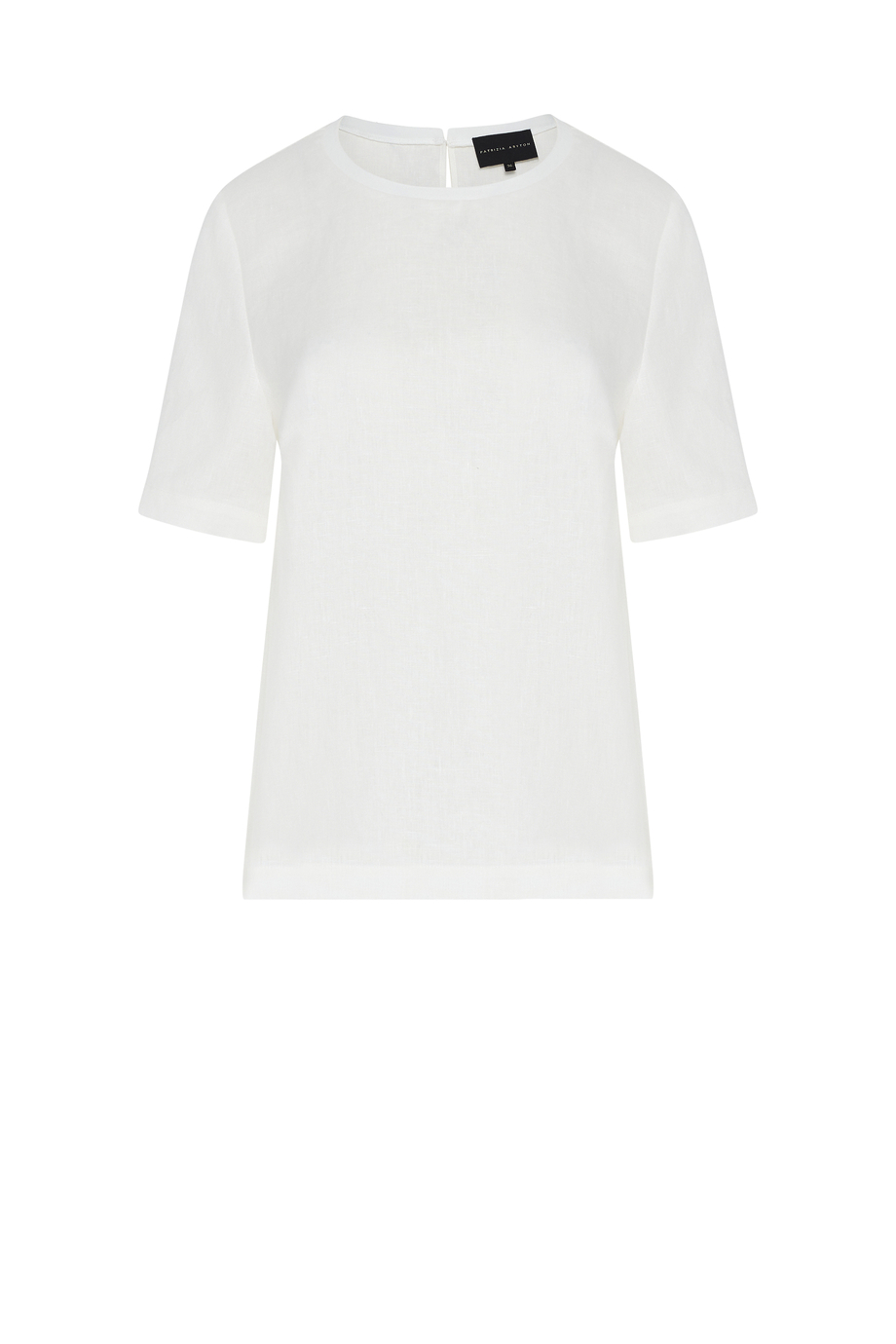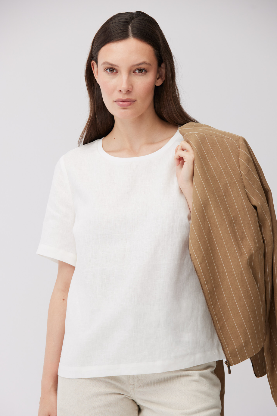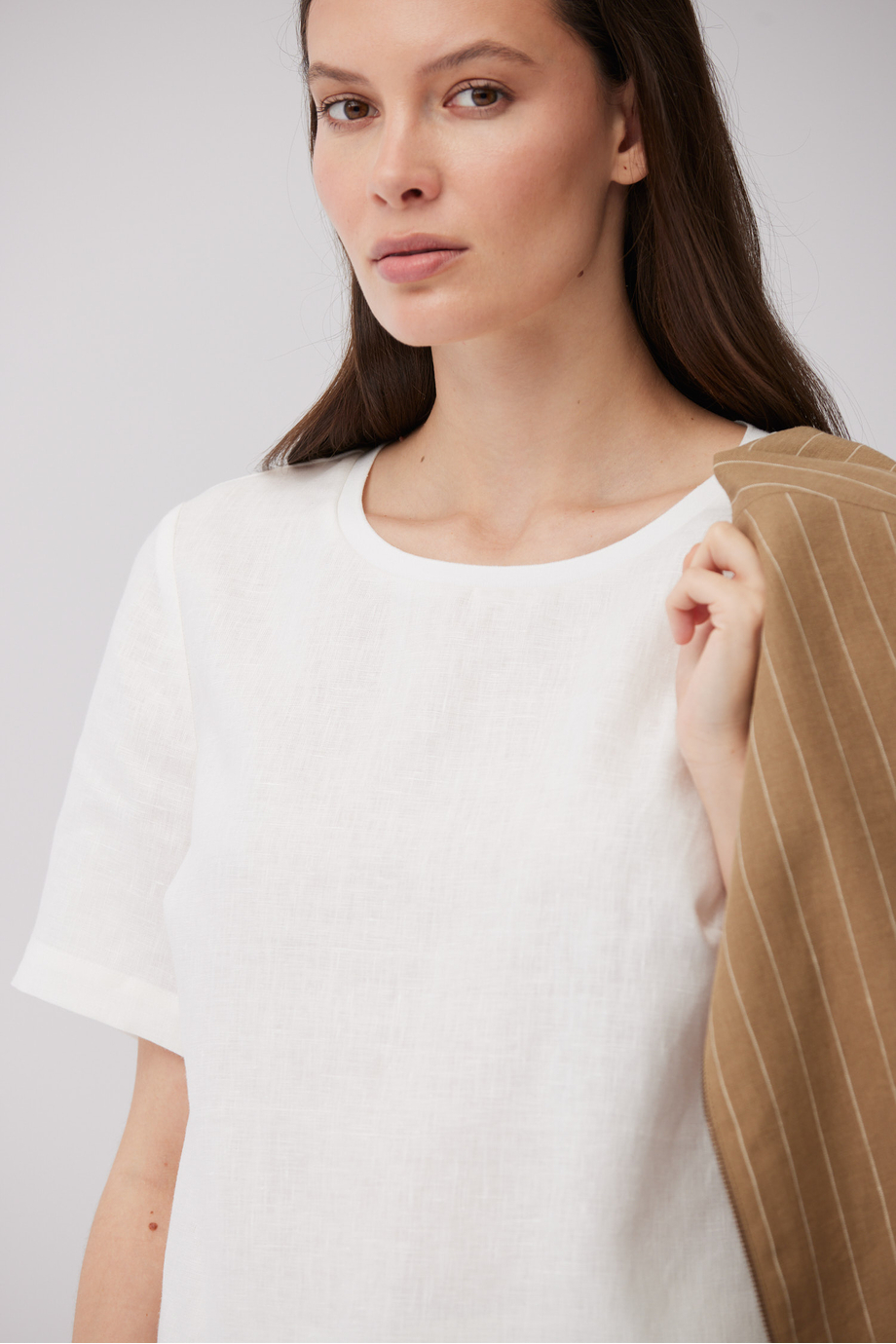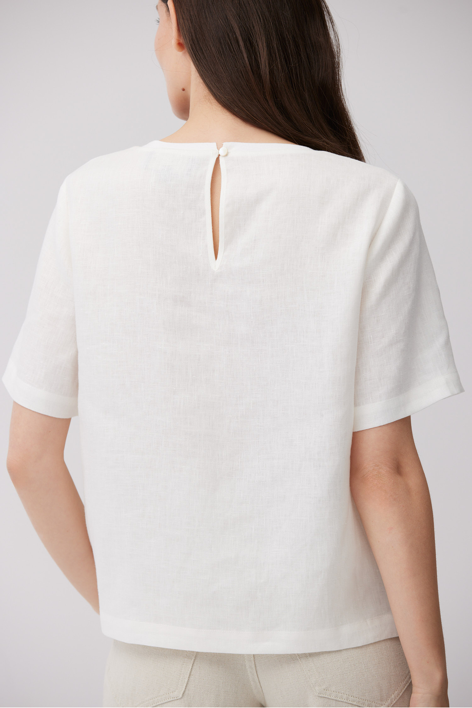Cămașă albă din in. Decolteu rotund, mânecă scurtă, croială tip cutie. La spate, închidere cu nasture.
