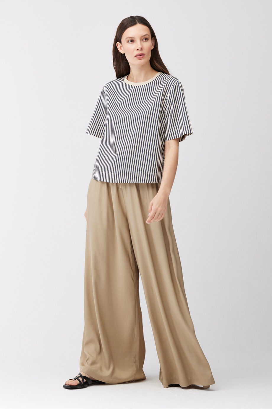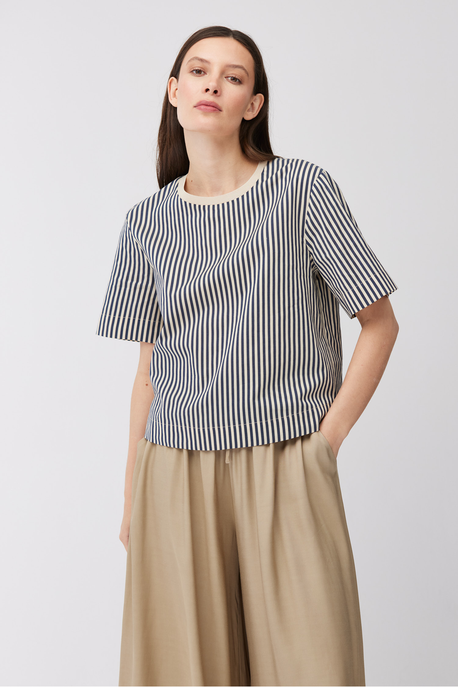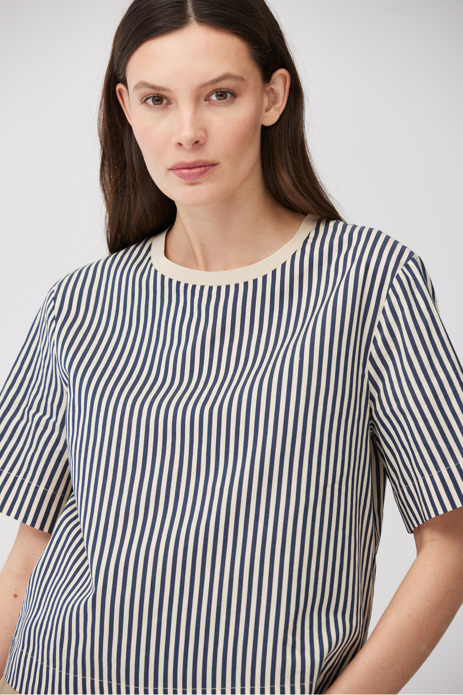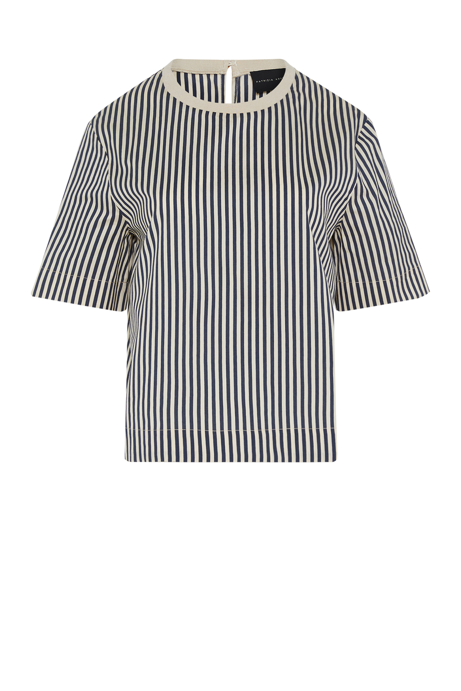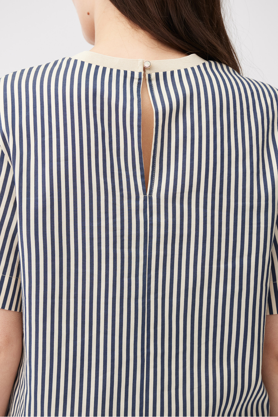 Bluză cu dungi dintr-un amestec de bumbac și mătase. Decolteu rotund, mânecă scurtă, croială tip cutie. La spate, închidere cu nasture.