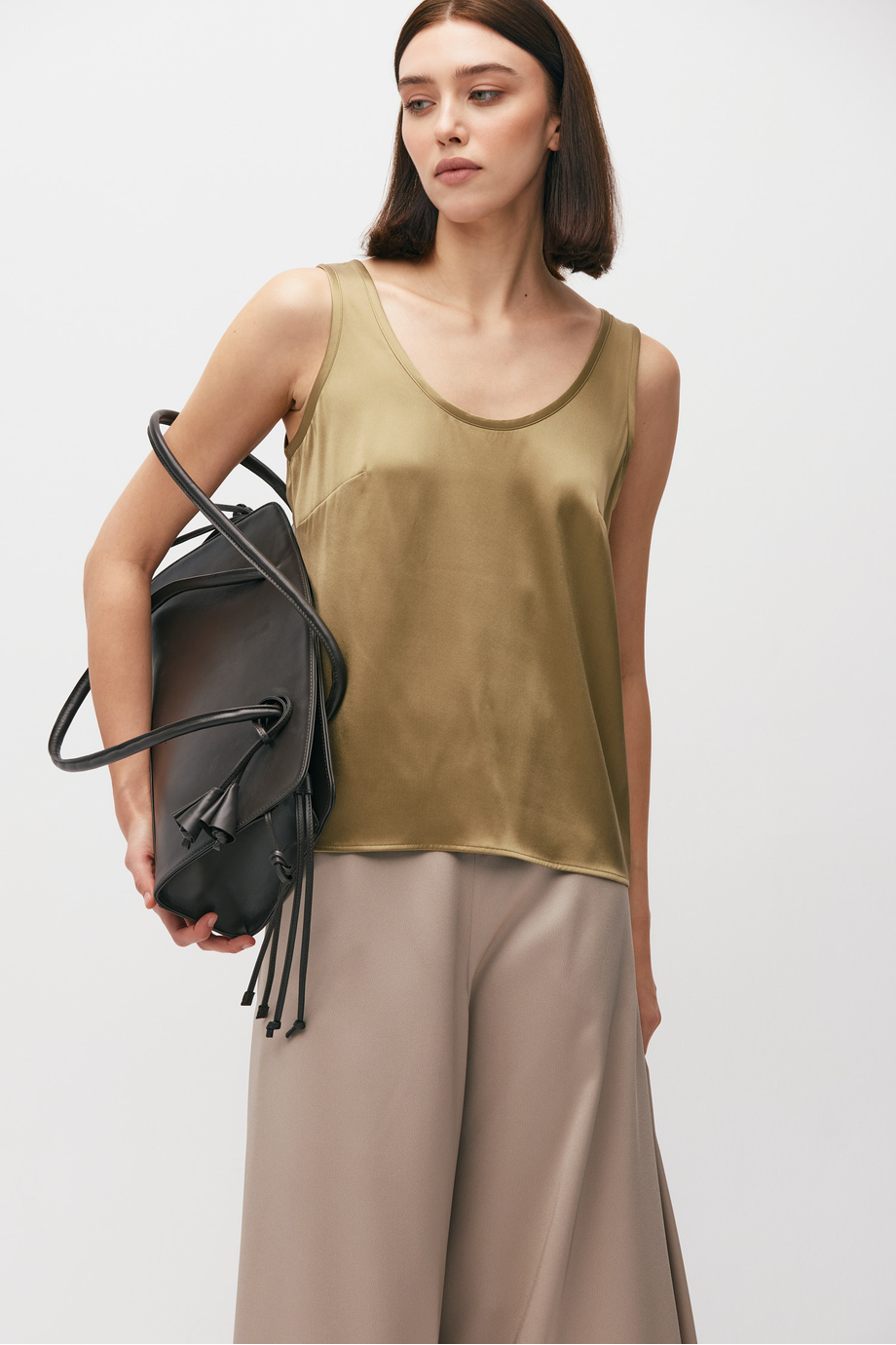 Top verde din mătase groasă. Bretele late, decolteu rotund, croială lejeră.