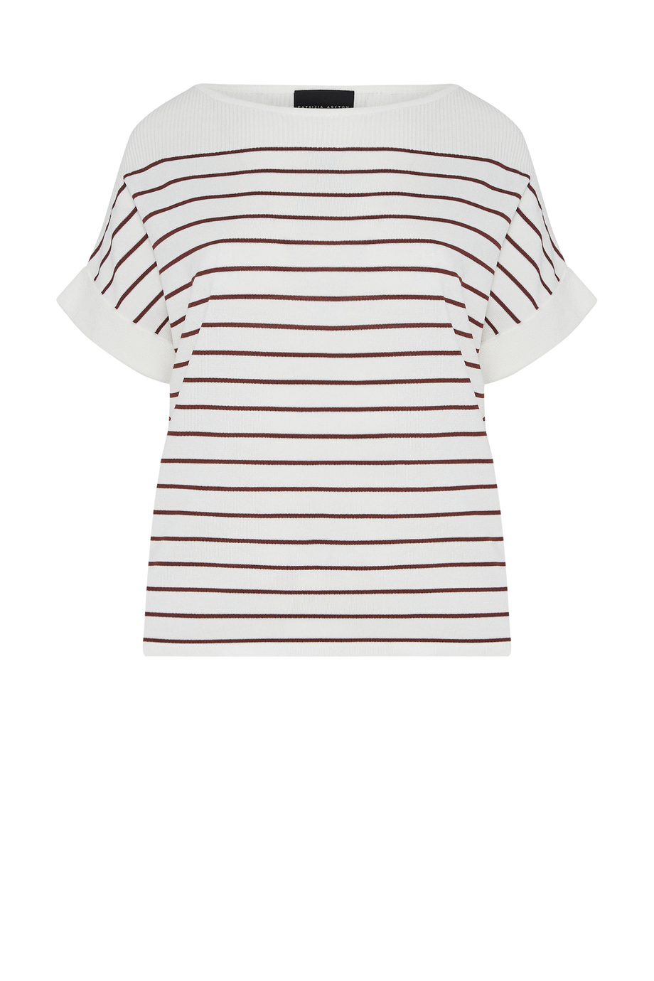 Bluză albă cu dungi maro. Decolteu tip barcă, mânecă scurtă. Croială lejeră. Tricot cu structură densă, realizat pe mașină cu finețea 14 GG.