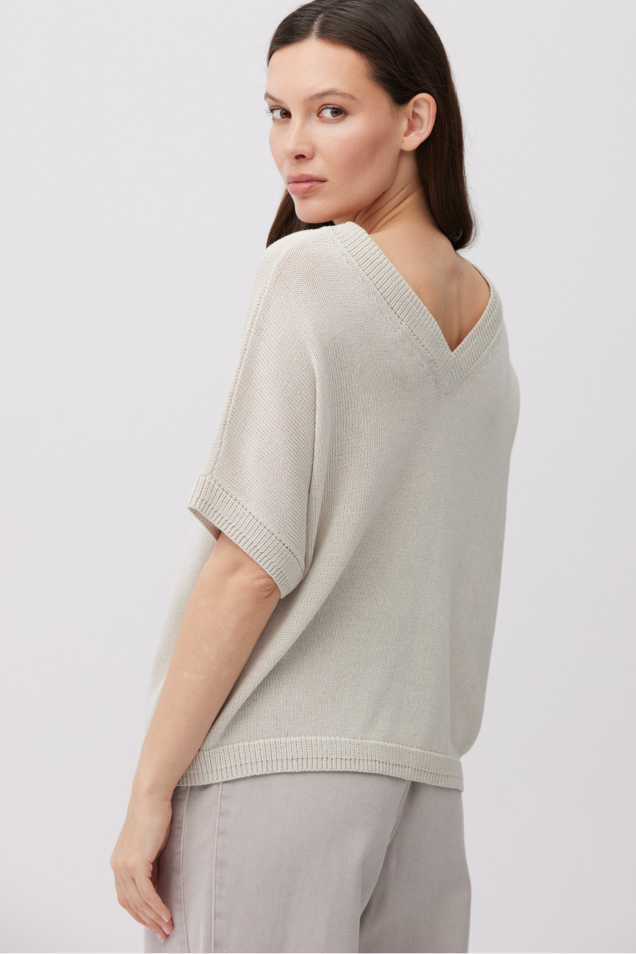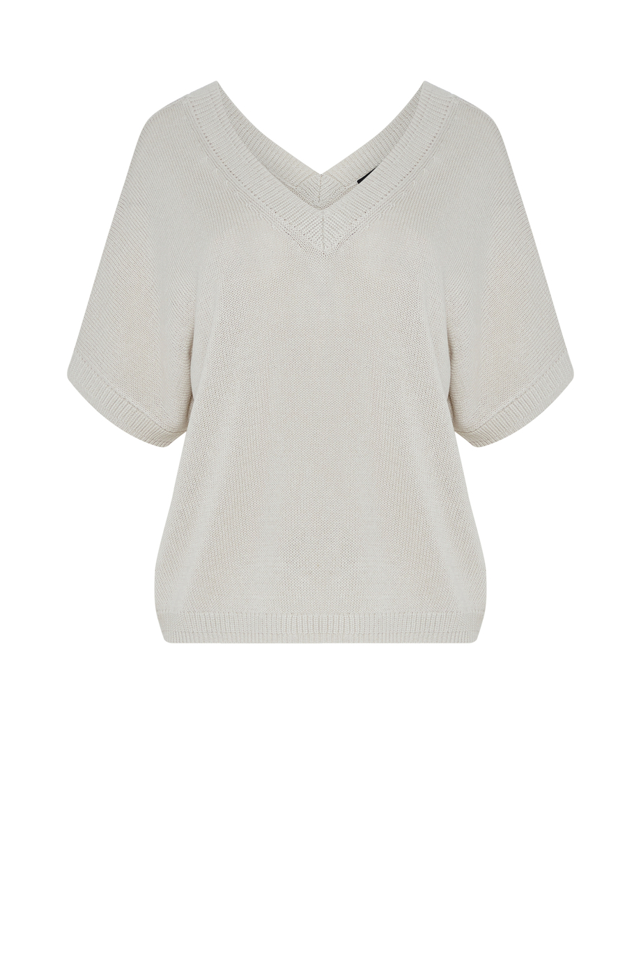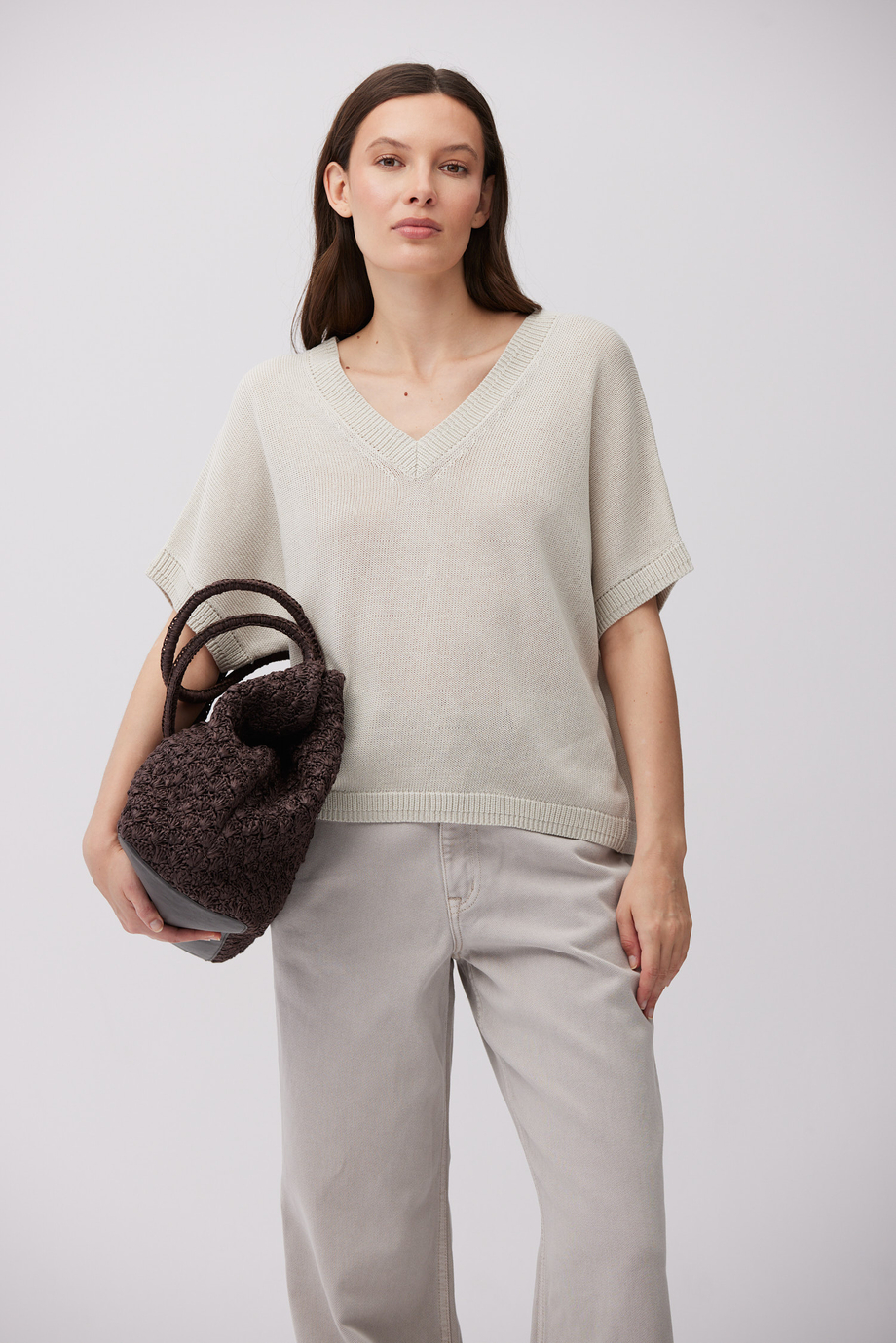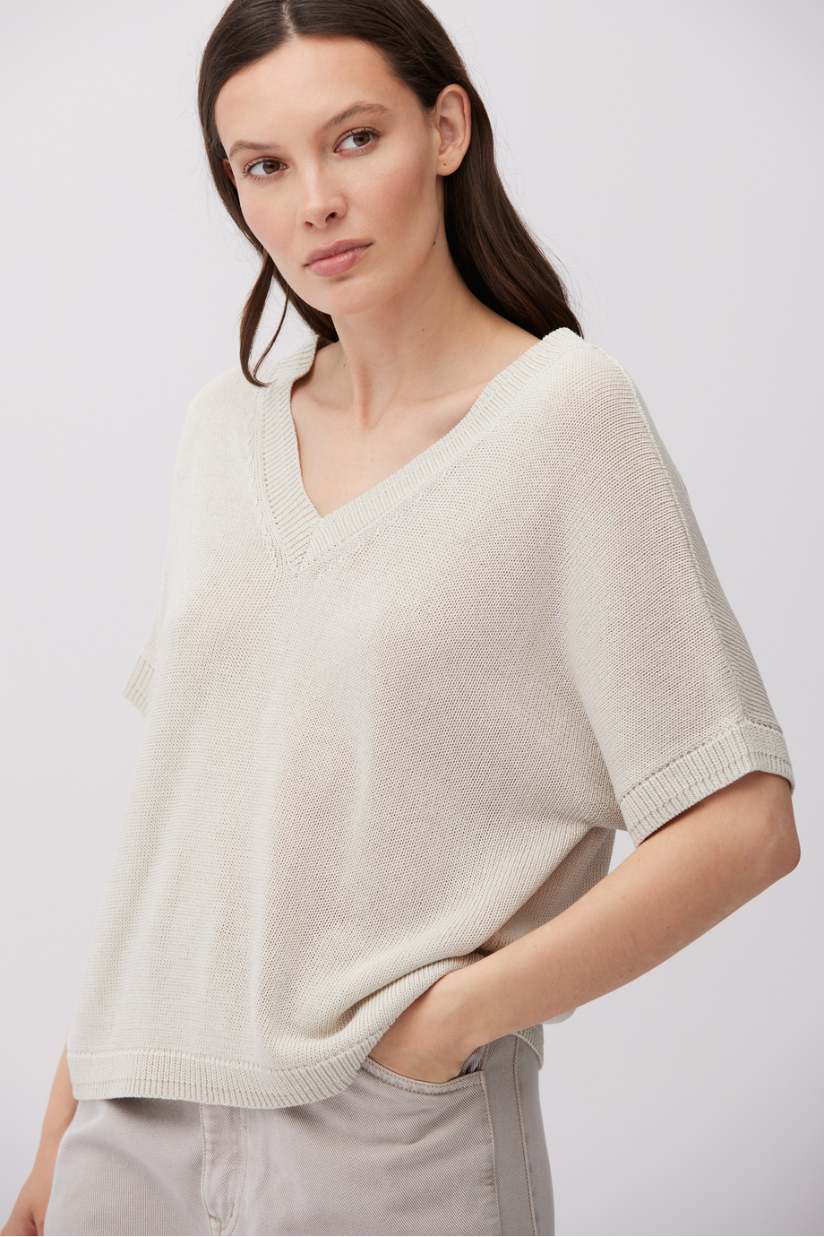 Pulover din amestec de in și lyocell. Mânecă scurtă, decolteu în V. Tricot moale, răcoros la atingere, cu structură lejeră realizată pe mașină cu finețea 7 GG. Croială simplă, lejeră. Culoare bej.