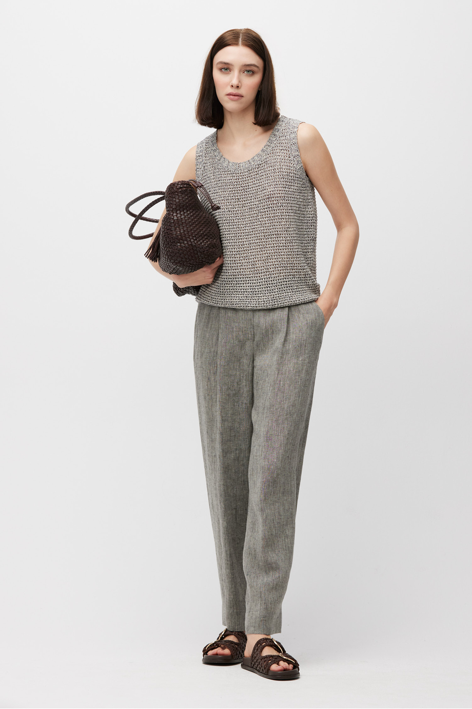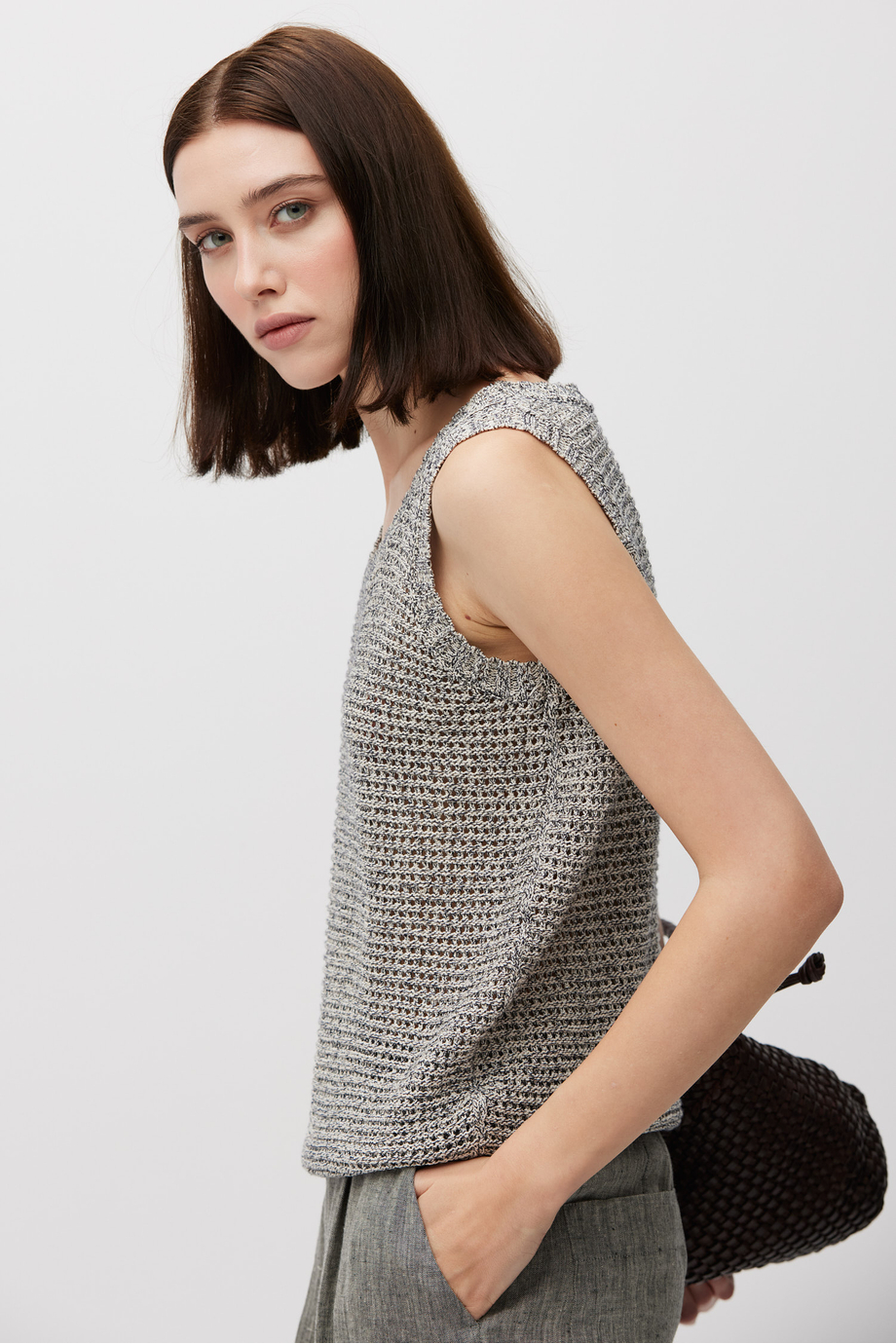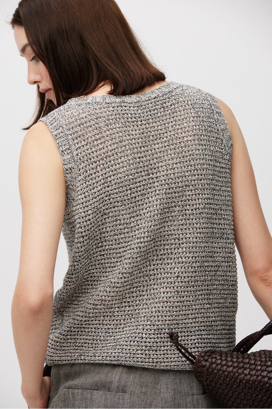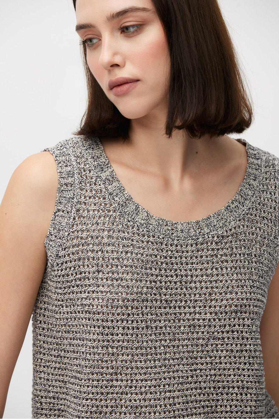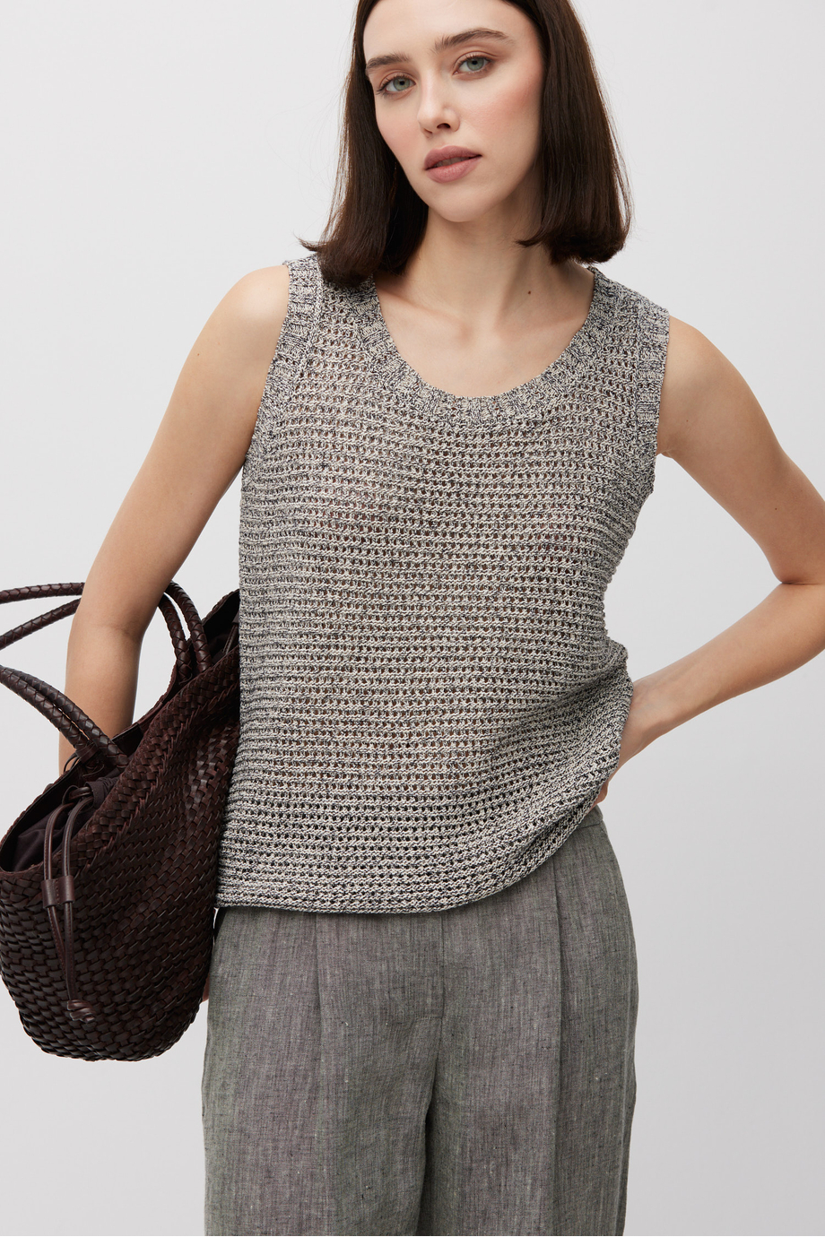Top din amestec de bumbac, in și lyocell. Bretele late, decolteu rotund, croială lejeră. Tricot cu structură aerisită. Culoare gri melanj.