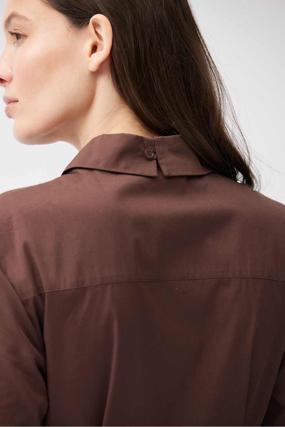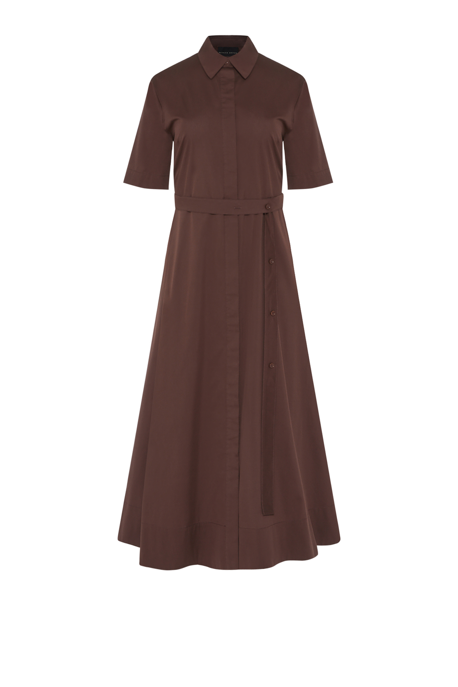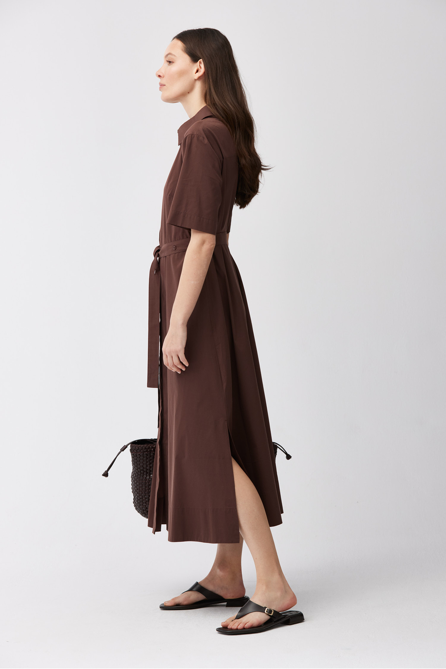 Rochie maro dintr-un amestec de bumbac și mătase. Guler, mânecă scurtă, închidere cu nasturi. Curea în talie. Lungime midi.