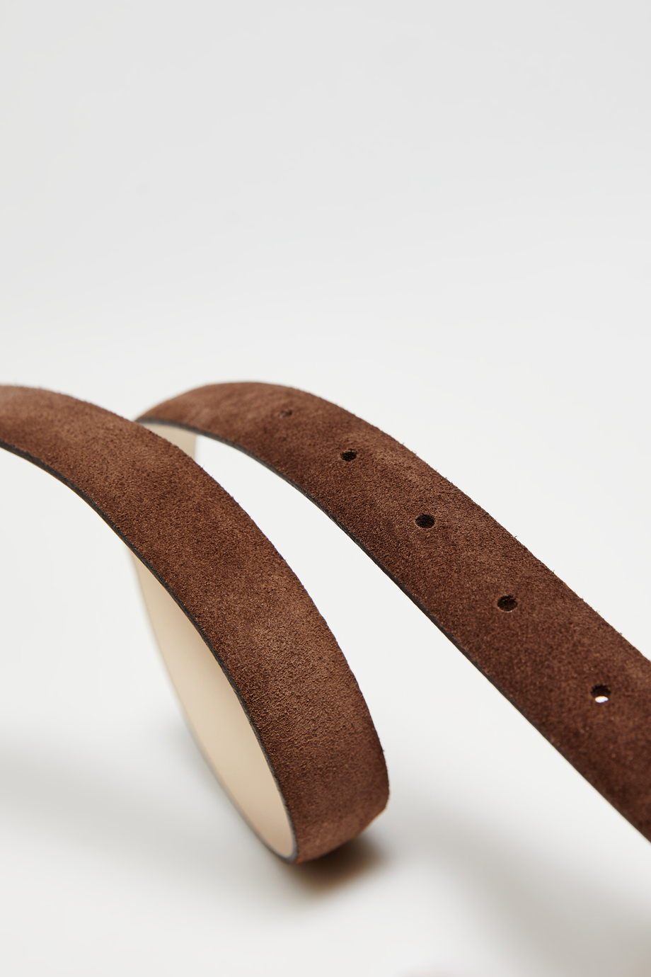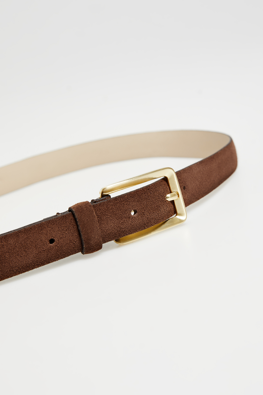 Curea subțire din piele întoarsă. Cataramă aurie. Culoare maro. Model cusut manual într-o manufactură portugheză