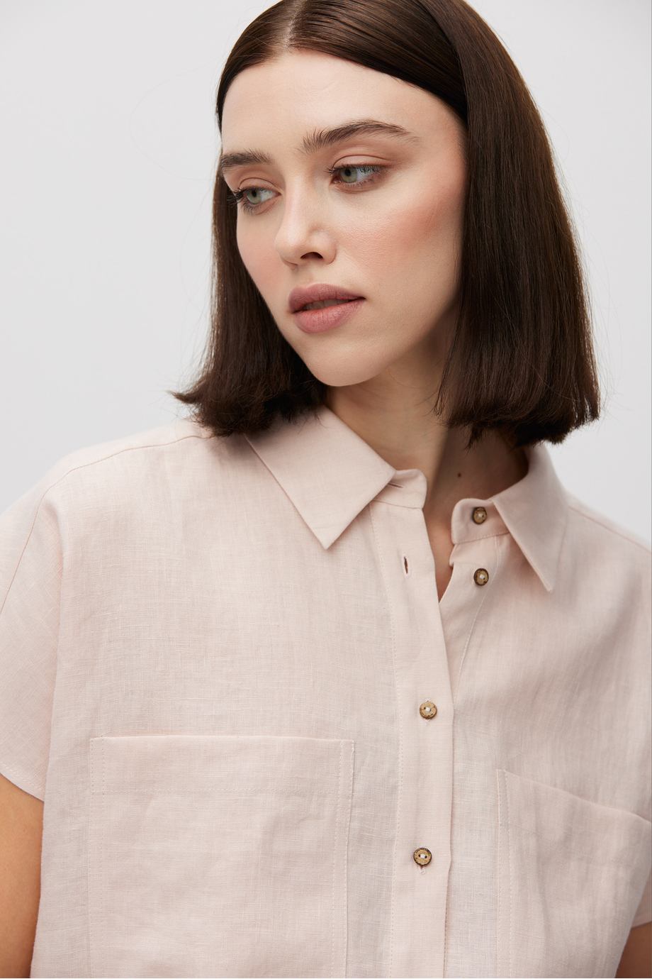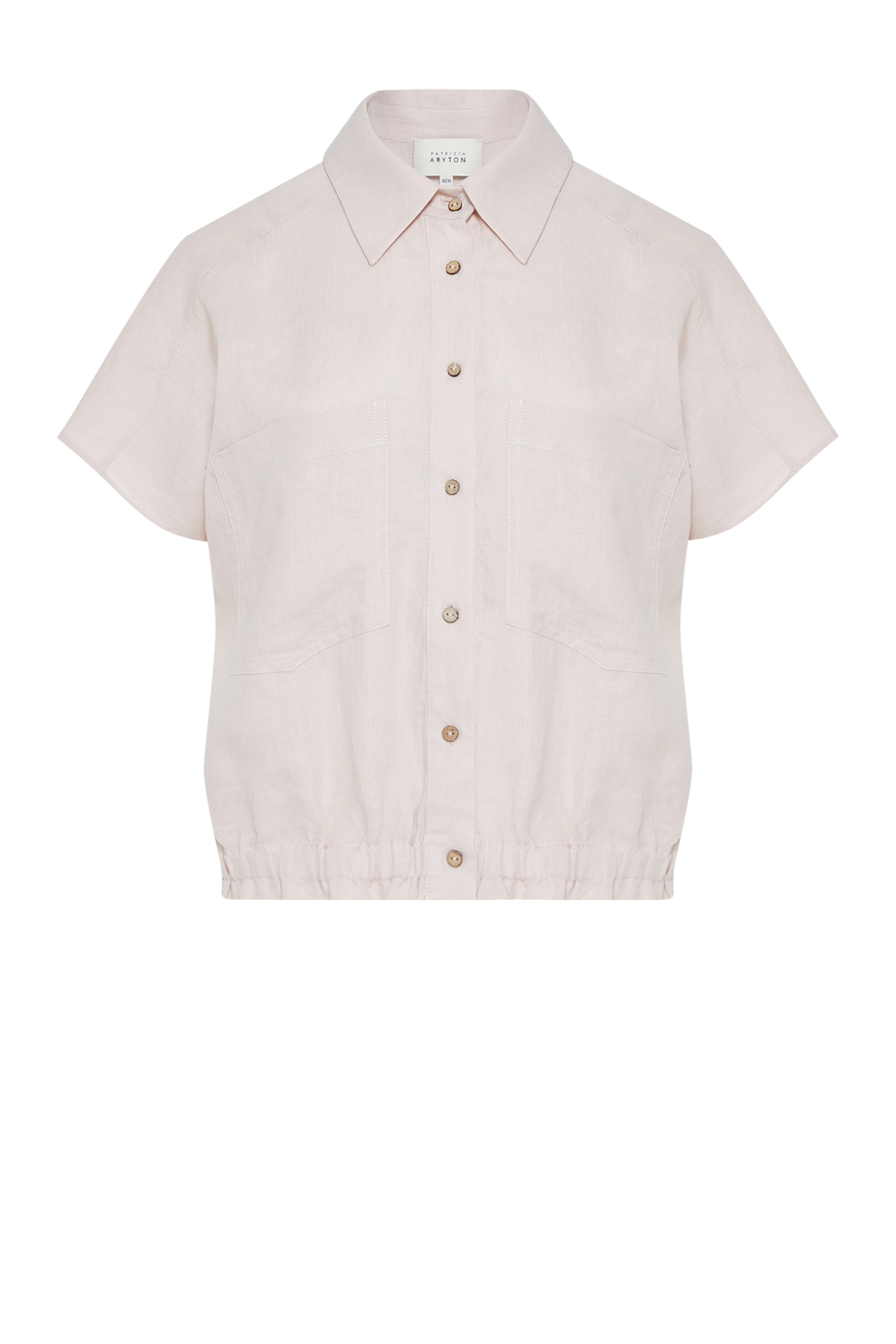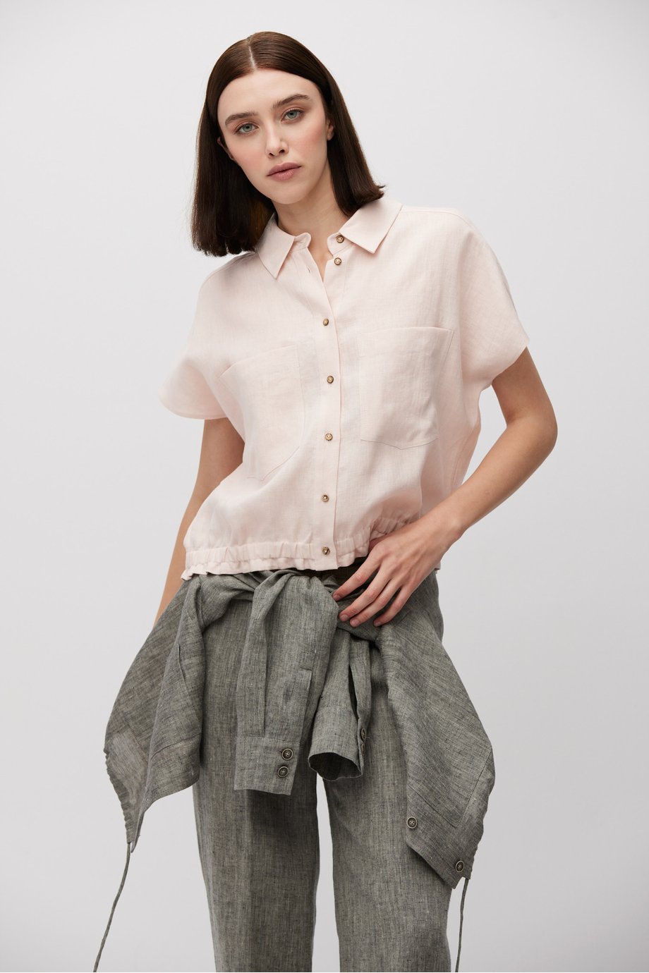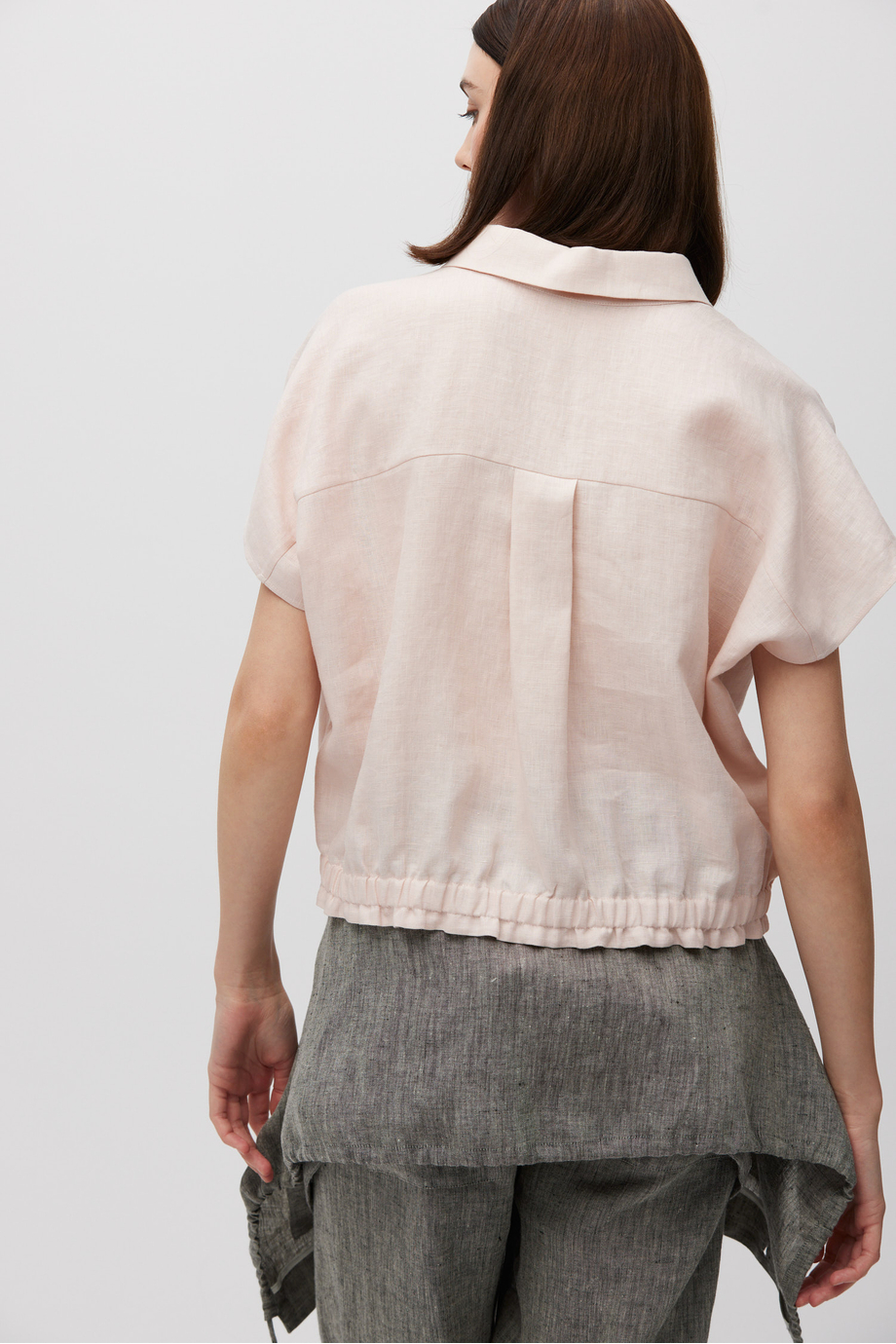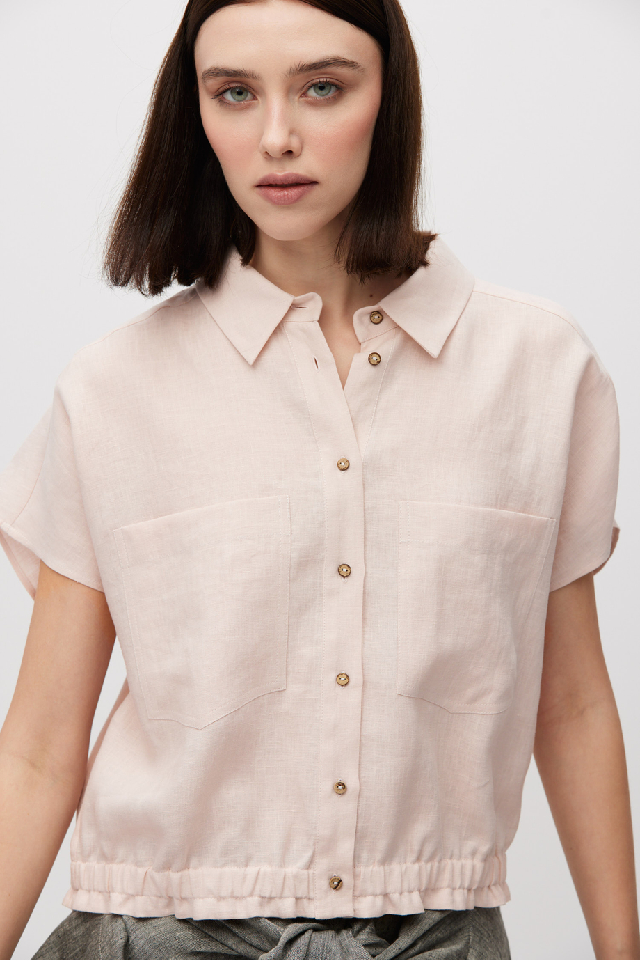 Bluză din in în culoare roz pudrat. Guler, închidere cu nasturi din cocos natural. Mânecă scurtă. Încrețire în talie.