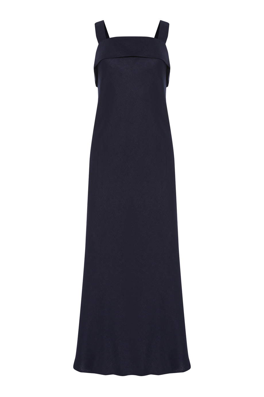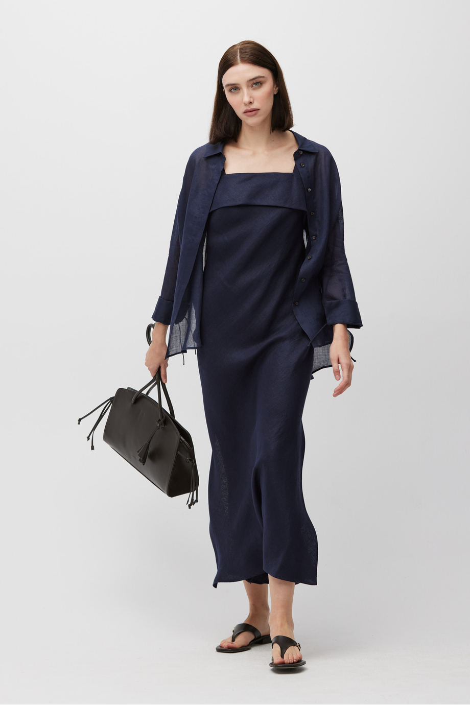 Rochie bleumarin din in. Decolteu pătrat. Croială apropiată de corp. Lungime midi, cu șlițuri laterale. Închidere la spate. Finisaj decorativ la interior. Pentru completarea setului – cămașă din ramie în aceeași culoare.