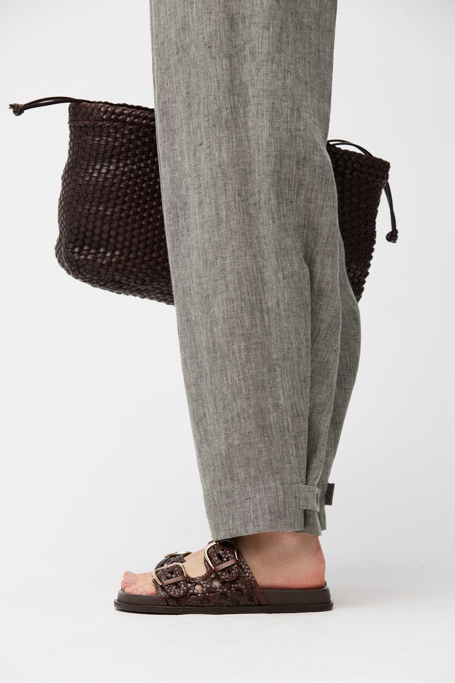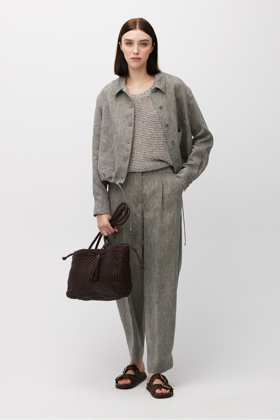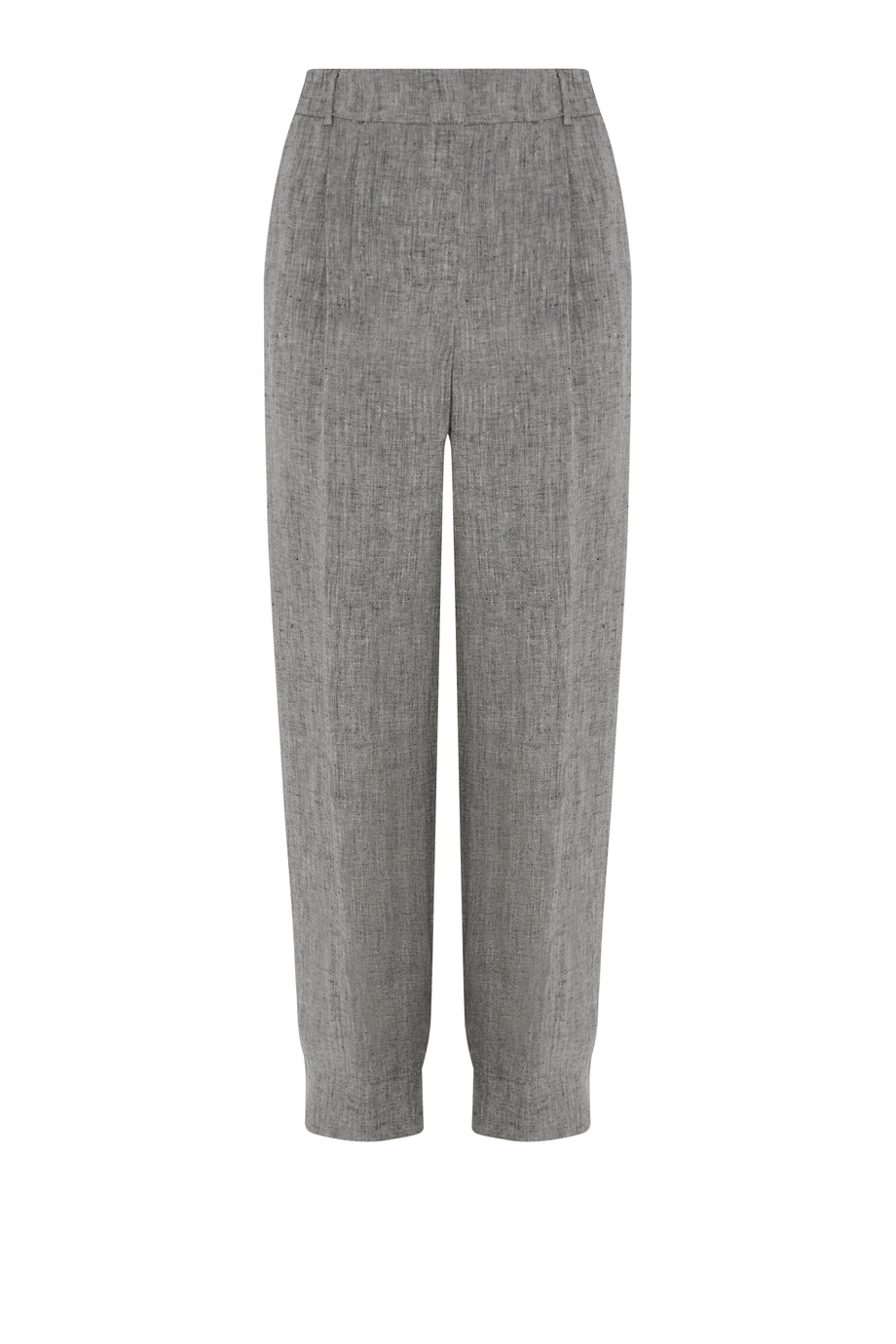 Pantaloni gri din in cu pense. Picior larg, cu posibilitate de prindere la spate. Închidere cu fermoar, cârlig și nasture corozo pe interior. Interior cu bandă decorativă. Buzunare. Pentru completarea setului – sacou din aceeași țesătură.
