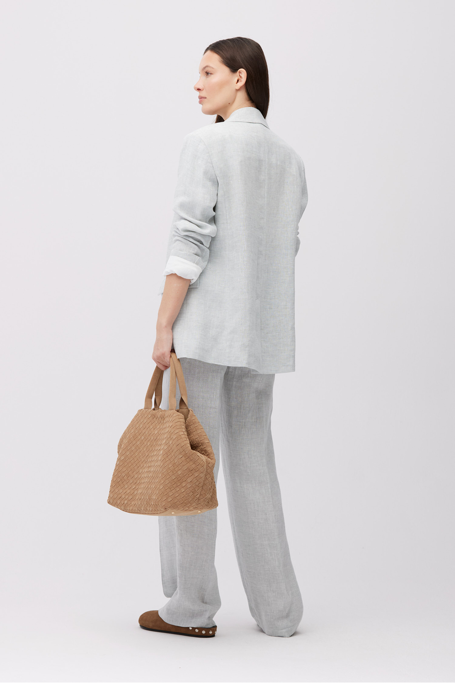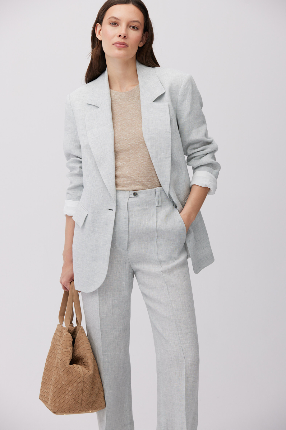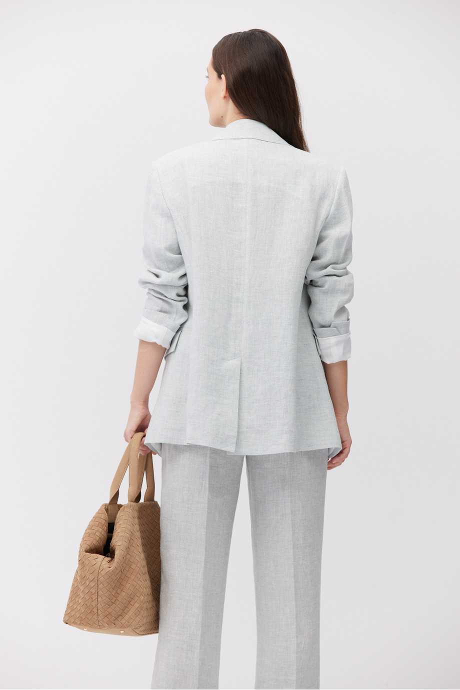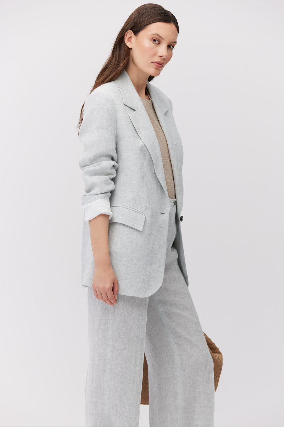 Sacou din in. Model cu un rând de nasturi. Croială regular. Mâneci lungi, buzunare. Semi-căptușit, cu piping decorativ la interior. Pentru completarea setului – pantaloni din aceeași țesătură. Culoare bleu.