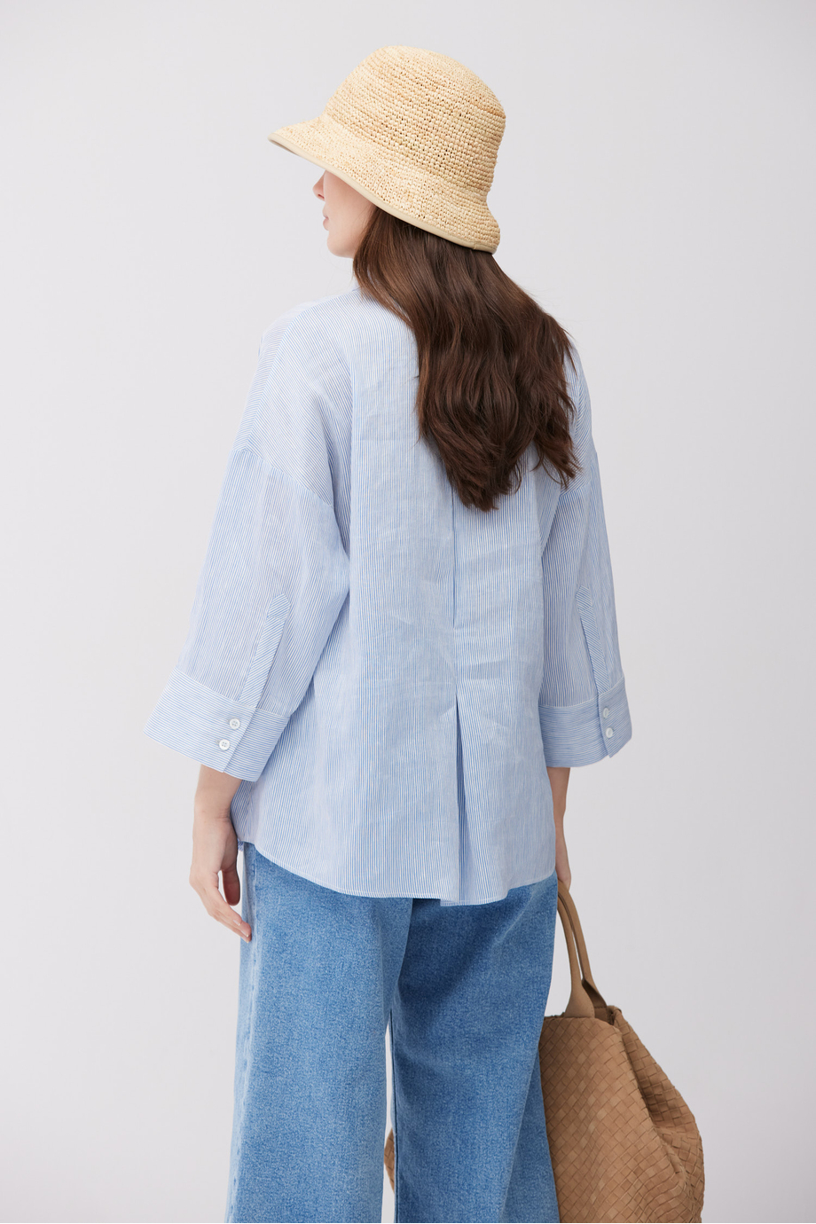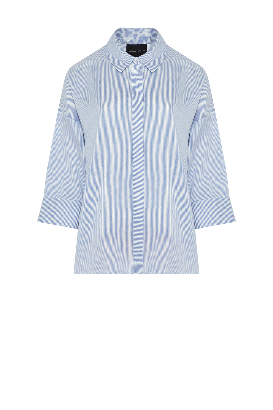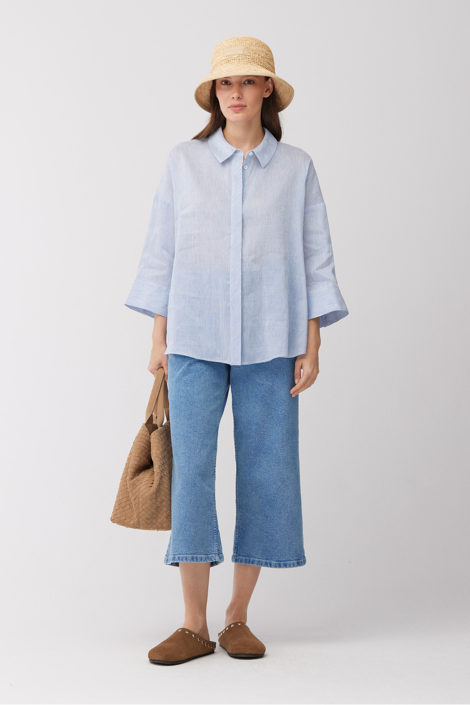 Cămașă în dungi din amestec de in și mătase. Guler, închidere cu nasturi în plachetă ascunsă, mânecă 3/4. Croială lejeră.