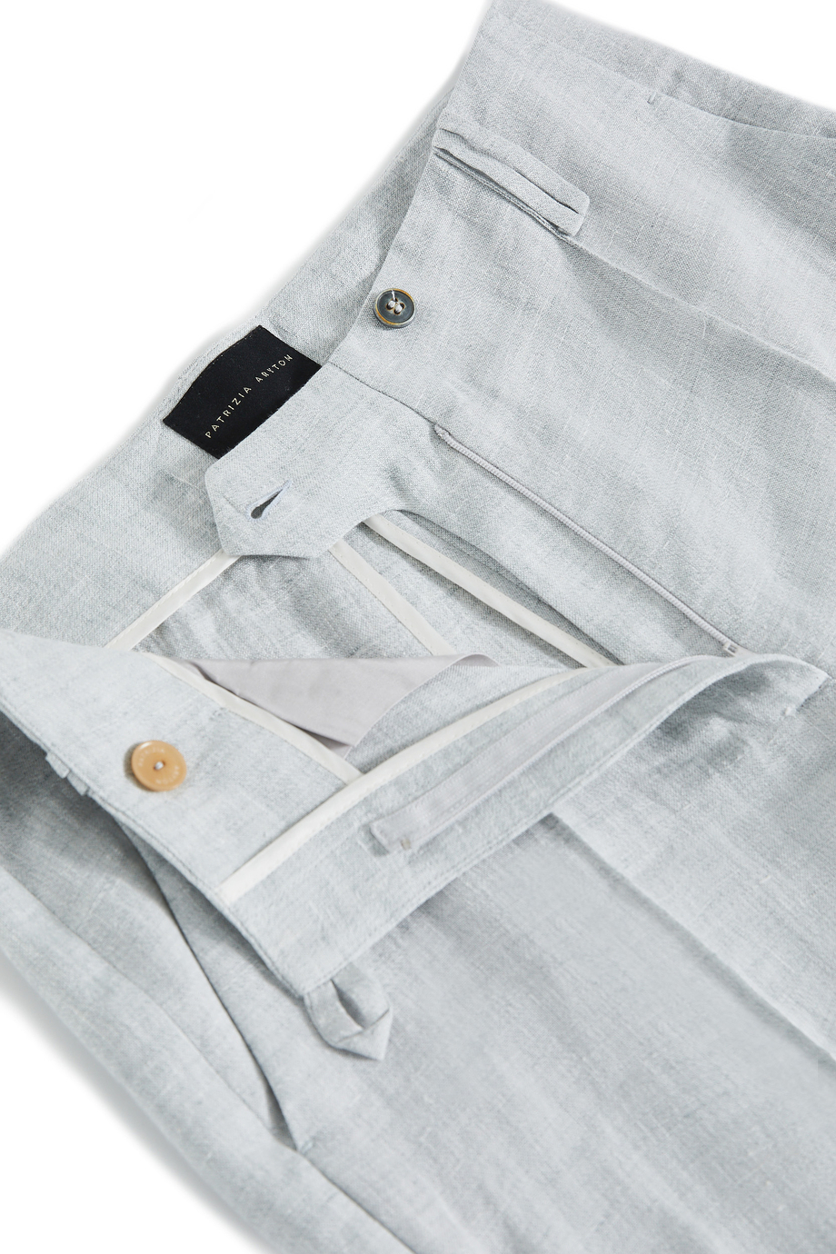 Pantaloni din in cu talie înaltă. Picior larg, închidere cu fermoar, cârlig și nasture corozo pe interior. Interior cu bandă decorativă. Buzunare. Culoare bleu. Pentru completarea setului – sacou din aceeași țesătură.